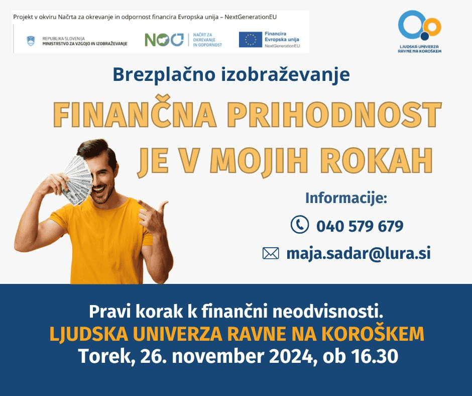 Na Ljudski univerzi Ravne se zavedajo, kako pomembno je finančno poznavanje, zato vas vabijo, da se pridružite brezplačnemu 40-urnemu izobraževalnemu programu "Finančna prihodnost je v mojih rokah", ki poteka v okviru projekta Finančni plac - Stičišče finančnega opismenjevanja za vsakogar.