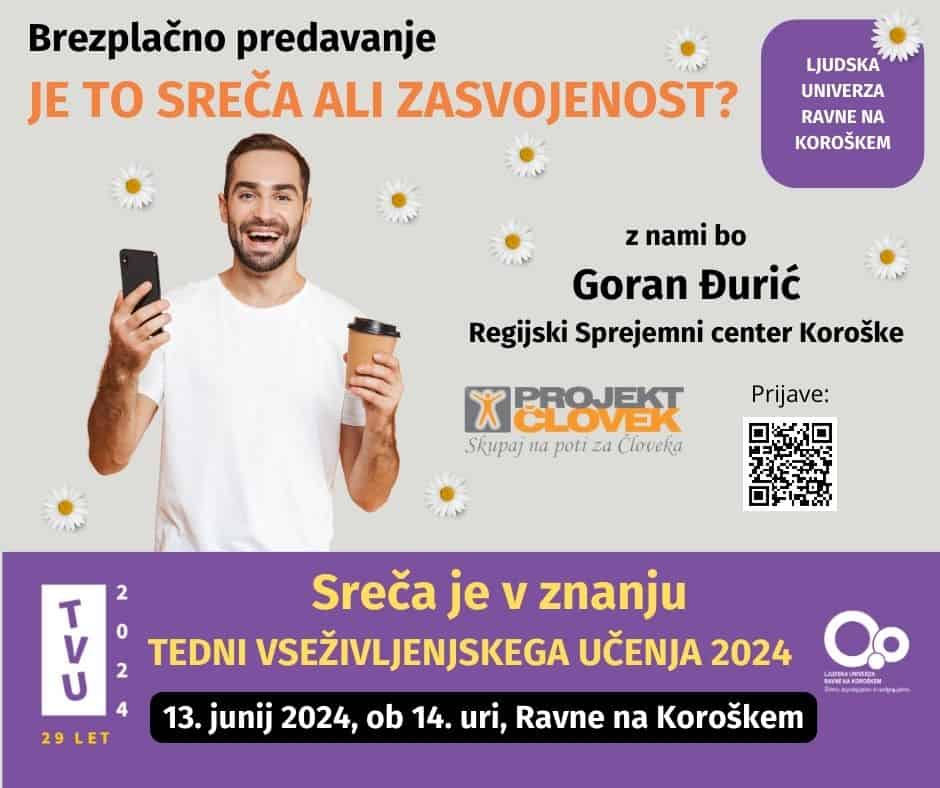 Brezplačno predavanje ''Je to sreča ali zasvojenost?'' bo v prostorih Ljudske univerze Ravne na naslovu Čečovje 12a, potekalo v četrtek, 13. junija 2024, ob 14. uri, predaval pa bo Goran Đurić, strokovni sodelavec Društva Projekt Človek, nevladne, humanitarne in neprofitne organizacije, ki izvaja programe za samopomoč, terapijo in socialno rehabilitacijo oseb z različnimi oblikami zasvojenosti.