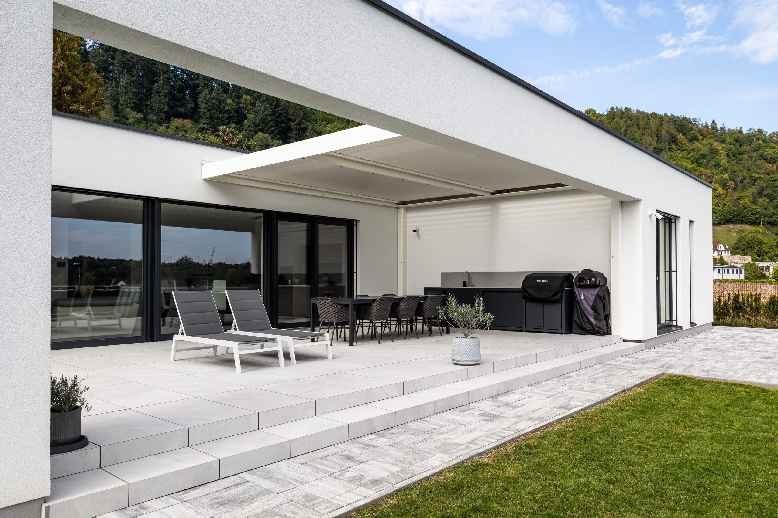- Arhitekturno dovršena pritlična zasnova s centralnim terasnim atrijem, ki ponuja zasebnost in stalno povezavo z vrtom.