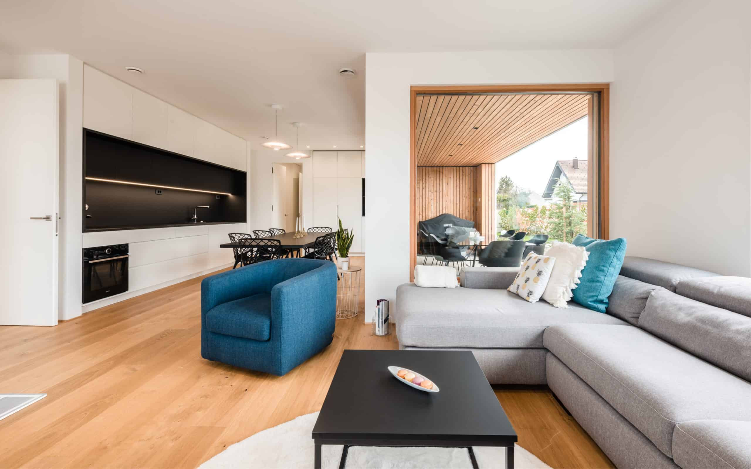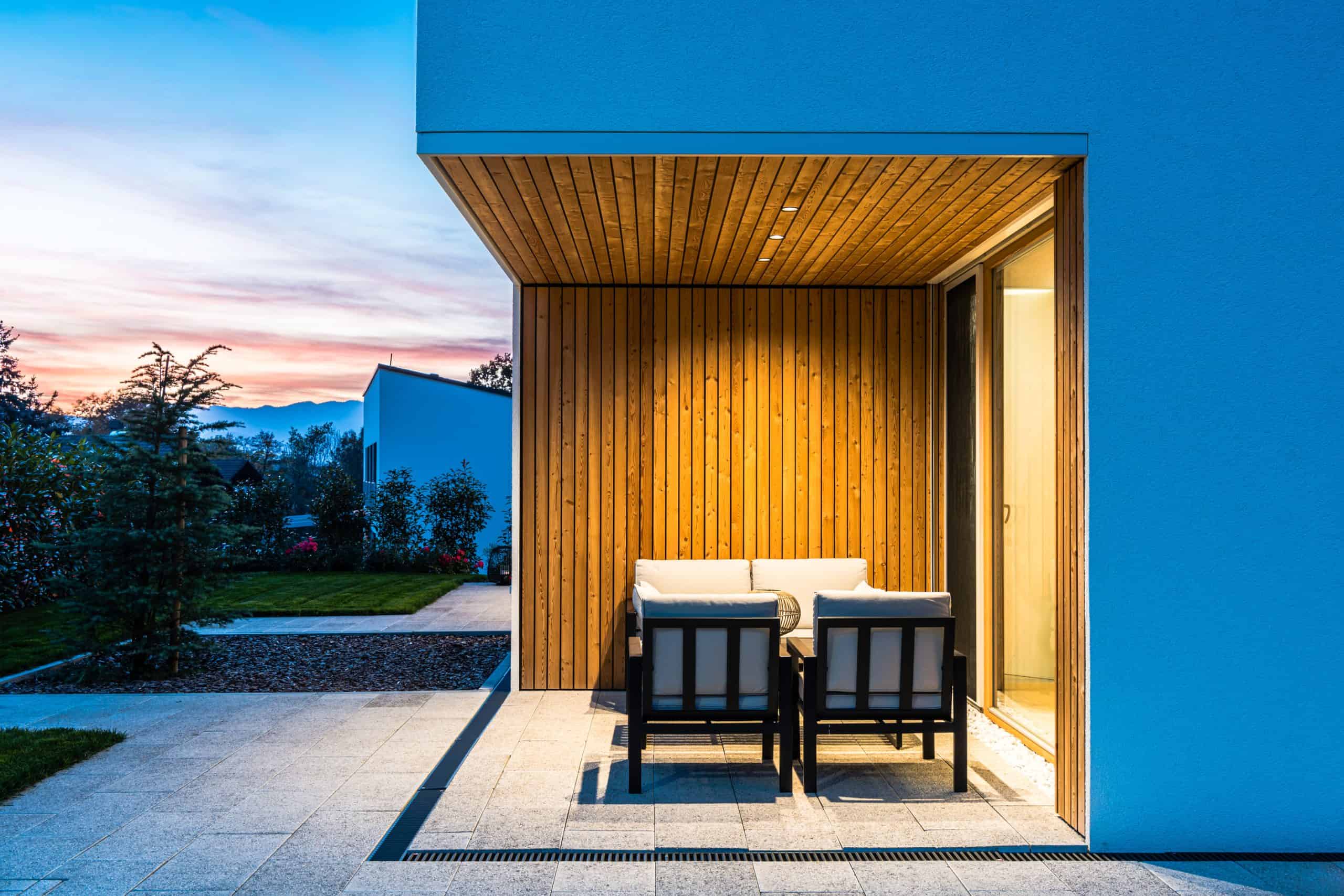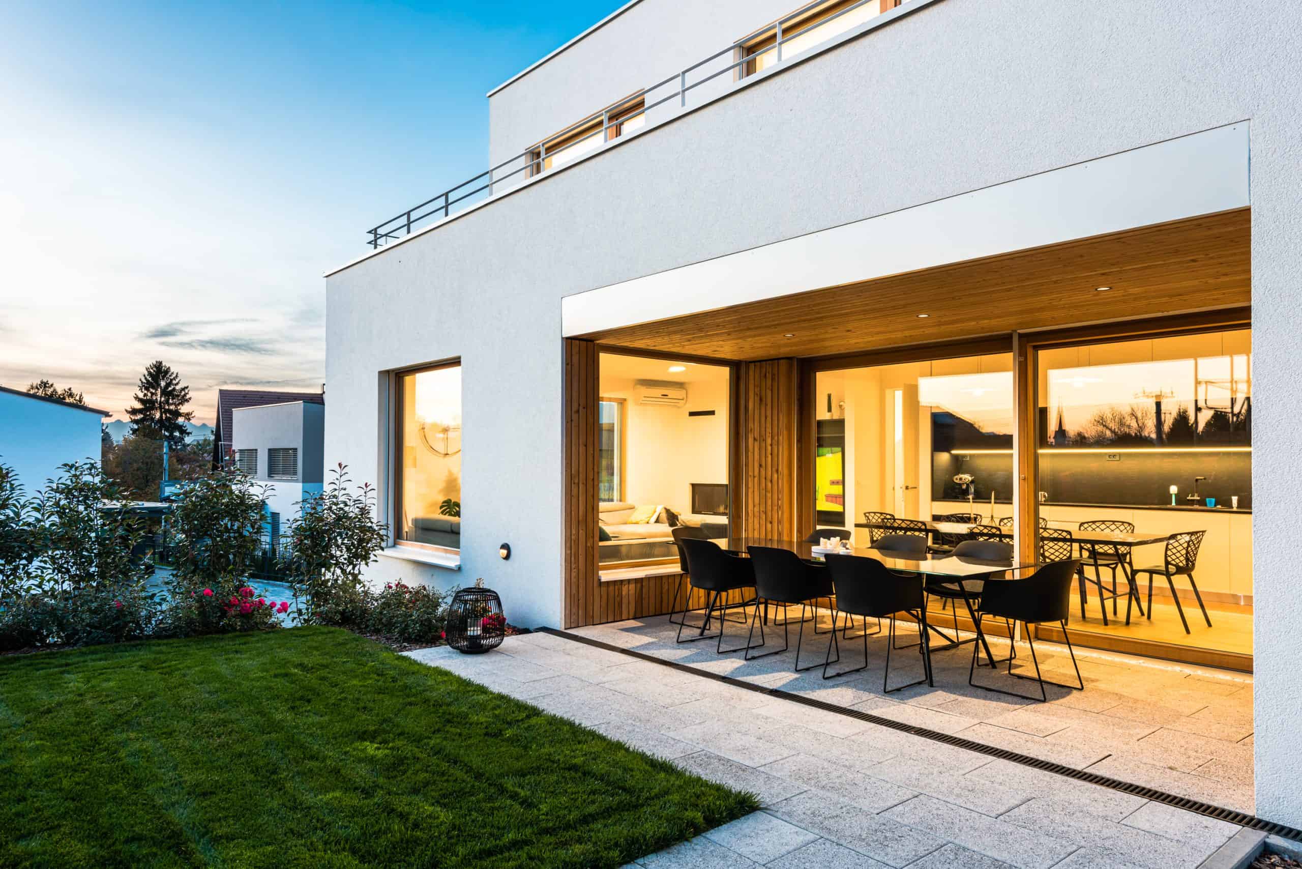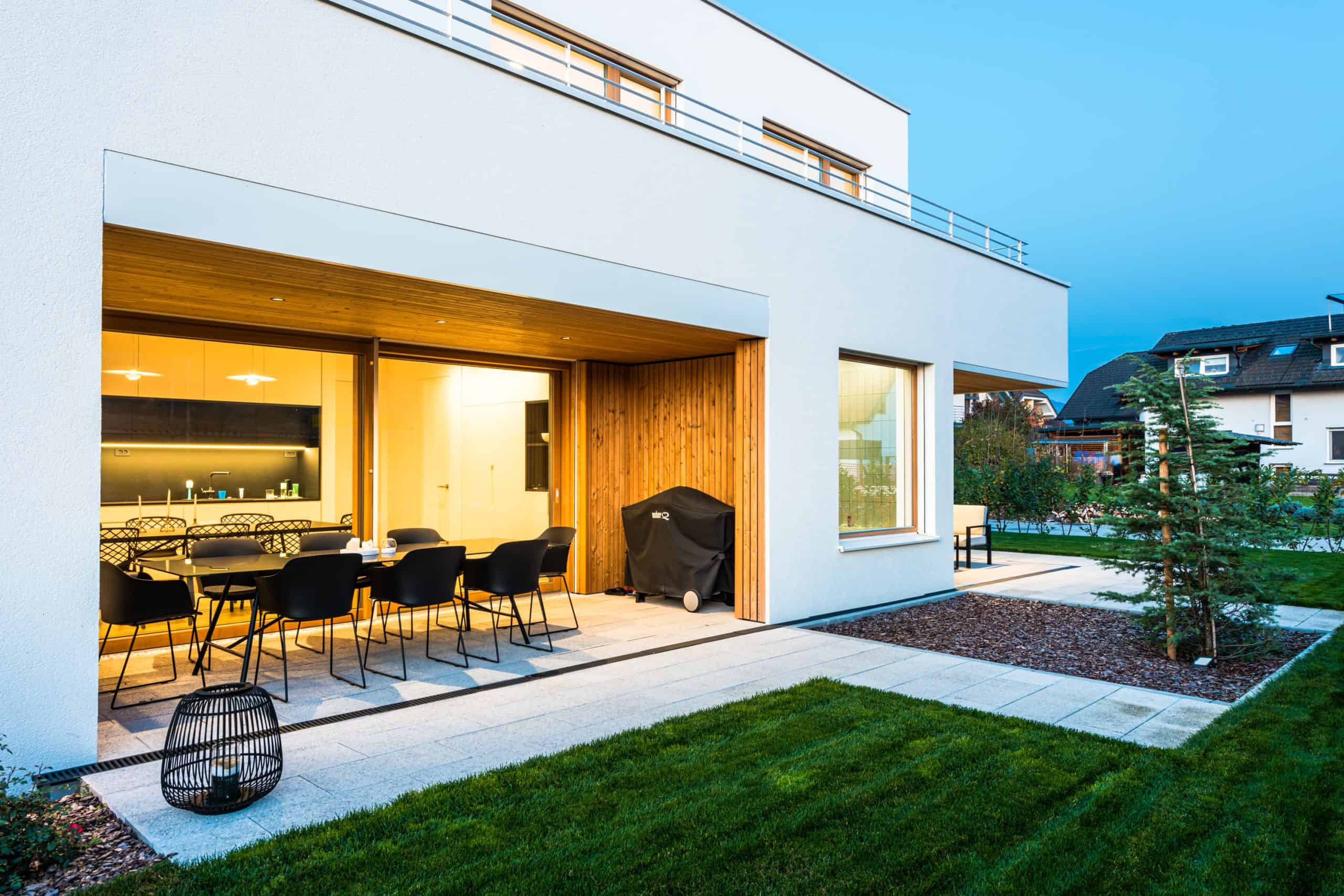 Zunaj stavbo krasijo številne niše, ki ponujajo zavetje vhodu in terasam, pa tudi sicer je na njej veliko izstopajočih detajlov, s katerimi moderno, individualno zasnovani dom z ravno streho dosega očarljivost, zaradi katere se družina z dinamičnim življenjskim slogom vsak dan rada vrača domov.