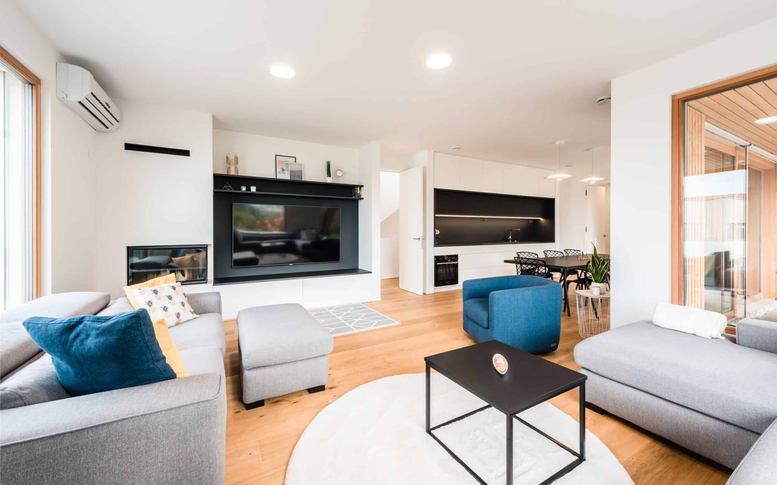 Individualna hiša s 184 kvadratnimi metri bivalne površine, ki so jo zasnovali Nava arhitekti, je arhitekturno zelo razgibana. Stropi na višini 270 centimetrov v notranjosti ustvarjajo občutek veličastne prostornosti. Iz kleti se prek stopnic povzpnemo v pritličje, v katerem so združene kuhinja, jedilnica in dnevna soba. Lesena tla v prostorih in okenski okvirji so tisti, ki interierju podarjajo barvno toplino in mehkobo. V pritličju so umeščene še spalnica, garderobna soba, kopalnica in dodatna terasa, ki je namenjena paru. Nadstropje višje kraljujejo otroci, ki imajo pod ravno streho tri otroške sobe in dve kopalnici. V istem nivoju izstopa otroška igralnica. Hiša se ogreva s toplotno črpalko zrak-voda in je opremljena s prezračevalnim sistemom z rekuperacijo zraka.