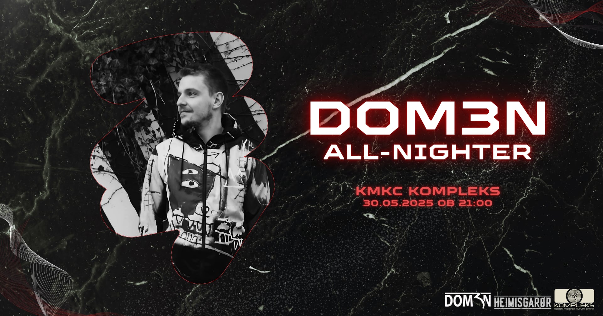 In ker dobrih stvari nikoli ni preveč, bomo v zadnjem koncertu meseca maja uživali v petek, 30. maja 2025, ko se bo večer hitro prevesil v noč, ki bo trajala in trajala in trajala. Domen Bezjak, aka DOM3N je Techno umetnik iz Slovenije, baziran v Avstriji. Njegovi prvi začetki segajo v leto 2011, ko se je preizkusil kot producent in v leto 2014, ko je prvič vrtel kot DJ. Zdaj že več let domuje in ustvarja v Avstriji, a nikakor ni pozabil na svojo rodno grudo. V letu 2022 je skupaj s koroškim nadtalentom Jako Ikovicem ustanovil založbo HEIMISGARØR, ki predstavlja temelj "Raw/Deep/Hypnotic" glasbe v povezavi s koroško kulturo. Domen je še naprej aktiven in se trudi ohranjati pečat koroške Techno scene, zato vas tokrat vabi v najlepšo klet na All-nighter v Kompleksu.