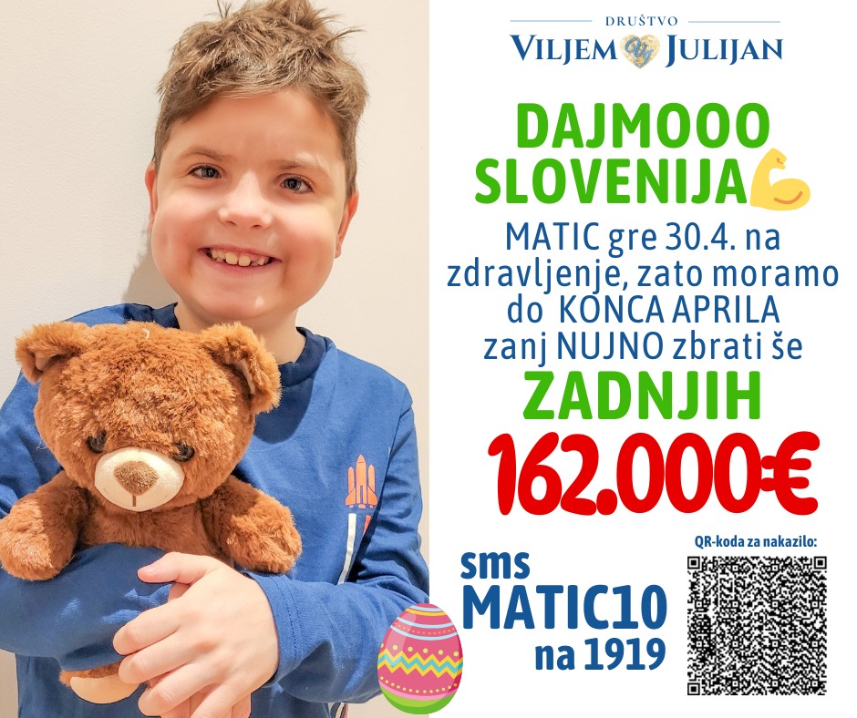 Zbiranje sredstev za malega Matica je v ciljni ravnini in če kdaj, je zdaj pomembno, da Slovenija stopi skupaj in Maticu omogoči še zadnja denarna sredstva, ki mu manjkajo za zagotovitev revolucionarnega genskega zdravila. Matic gre 30. aprila že na zdravljenje v tujino, zato morajo zanj do konca aprila nujno zbrati še zadnjih 162.000€ za gensko zdravilo Elevidys.