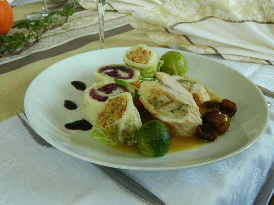 Postregli vam bomo s Puranjo rolado s kostanjem. Ohrovtovimi zvitki z ajdovo kašo, porom in lisičkami. Krompirjevim štrukljem z rdečim zeljem. Brstičnim ohrovtom. Glaziranim kostanjem ter Lešnikovo panakoto s kuhanimi hruškami, sladoledom in drobljencem.
