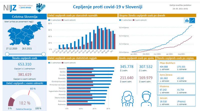 Na današnji dan je po navedbah portala cepimo.se v Sloveniji s prvim odmerkom cepljenih 653.310 ljudi, z vsemi odmerki pa 381.619 ljudi. Največ cepljenih, tako s prvim kot vsemi odmerki, je starih med 70 in 89 let. Po spolu prednjačijo ženske, še izhaja iz podatkov na omenjenem portalu.