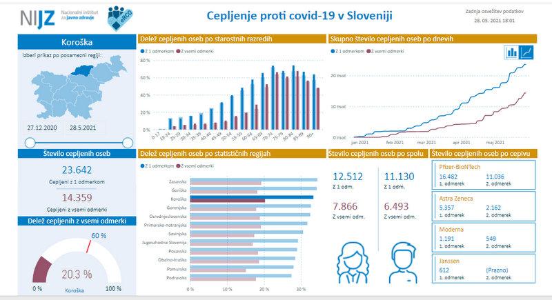 V celotni Sloveniji je po teh podatkih cepljenih proti covidu-19 s prvim odmerkom 31,1 odstotka prebivalstva ter z vsemi odmerki 18,2 odstotka. V državo je bilo dobavljenih skupno 1.119.480 odmerkov cepiva, od tega največ od proizvajalca Pfizer-BioNTech.