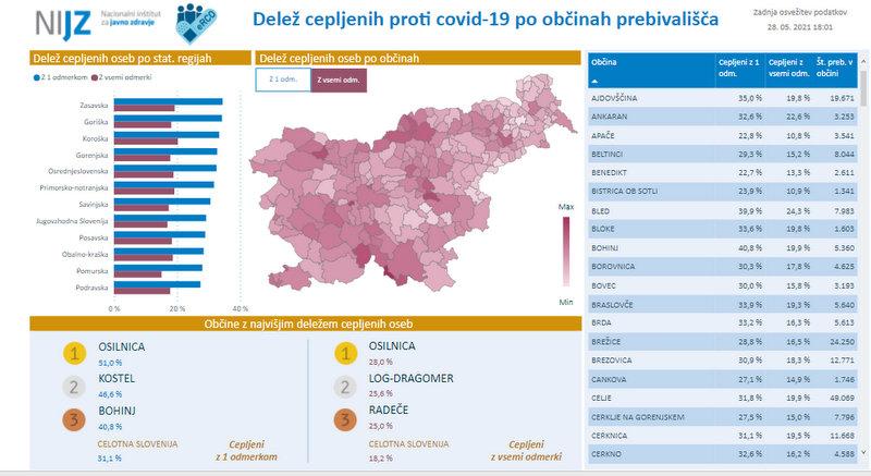 Največ cepljenih s prvim odmerkom je v občinah Osilnica (51 odstotkov), Kostel (46,6 odstotka) in Bohinj (40,8 odstotka). Osilnica je na prvem mestu tudi med občinami z največjim deležem prebivalstva, cepljenega z vsemi odmerki cepiva (28 odstotkov), sledita Občina Log - Dragomer (25,6 odstotka) in Radeče (25 odstotkov).