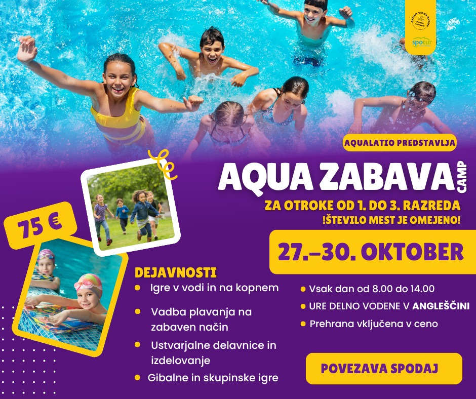 Počitnice, zabava in dobra družba so najboljša kombinacija, kako preživljati prosti čas. Med jesenskimi počitnicami vas Bazenski kompleks Aqualatio v sodelovanju s Spoturjem vabi, da se pridružite Aqua zabavi, namenjeni otrokom od 1. do 3. razreda.