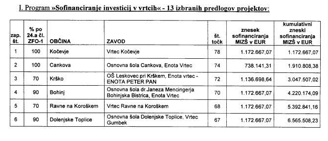 Na javni razpis je sicer prispelo 160 vlog 126 občin, od tega 67 vlog za naložbe v vrtce in 93 vlog za naložbe v osnovno šolstvo. Pri treh od teh je šlo za projekte v šolstvo narodnosti, in sicer dva v osnovno šolo in en v vrtec. Skupna vrednost vseh na razpis prijavljenih investicij znaša dobrih 91,6 milijona evrov.
