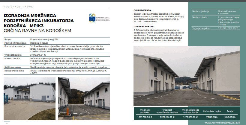 Med 20 najboljših se je uvrstil tudi projekt Občine Ravne na Koroškem Izgradnja mrežnega inkubatorja Koroška – MPIK3, ki skupaj šteje šest novih poslovno-industrijskih enot in 26 novih parkirnih mest.