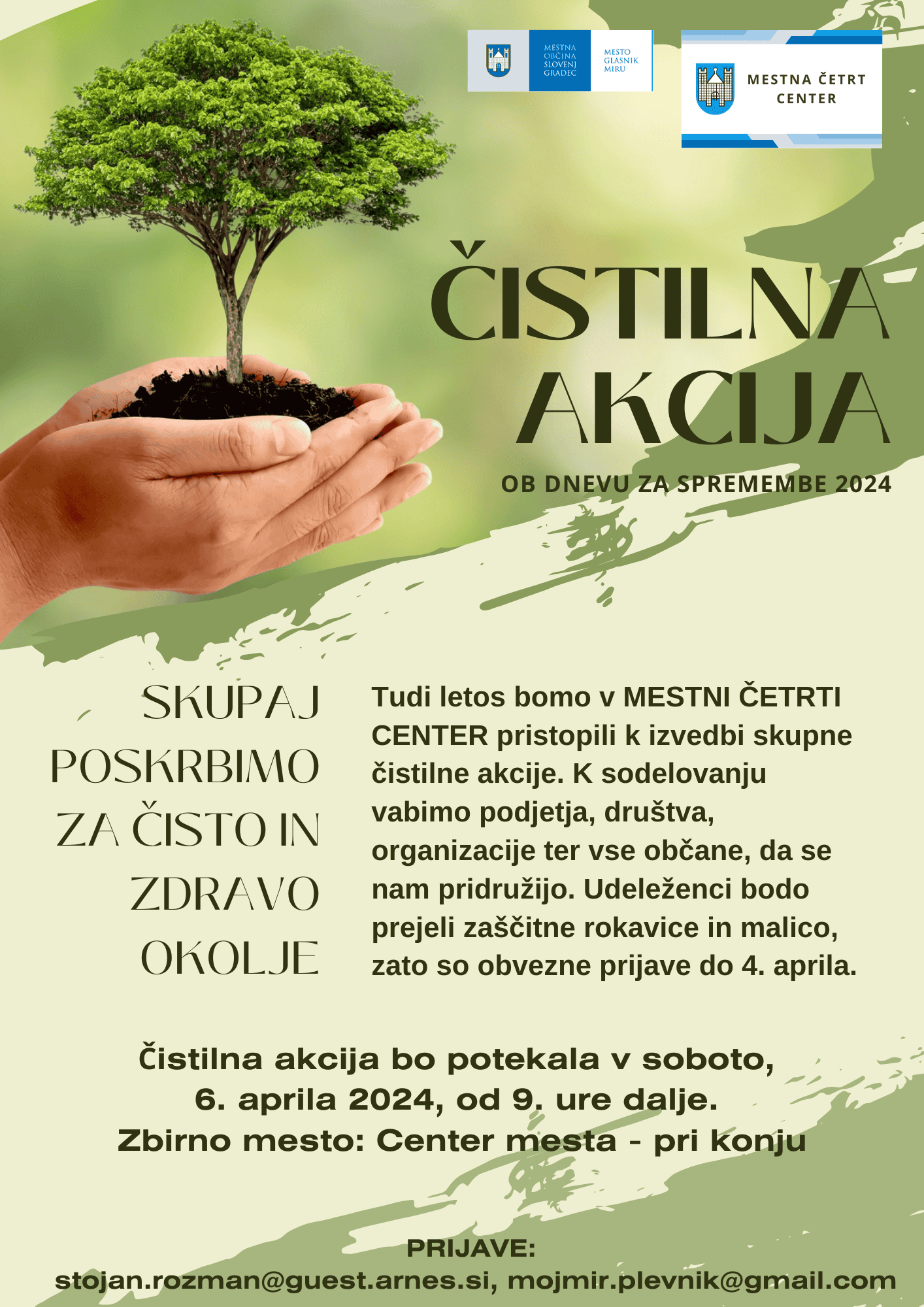 V celotni občini bo potekala čistilna akcija, na katero vabijo tudi člani mestne četrti Center. Tako k sodelovanju vabijo vsa podjetja, društva, organizacije ter vse občane, da se pridružijo čistilni akciji, s katero bodo poskrbeli, da bo mesto še lepše.