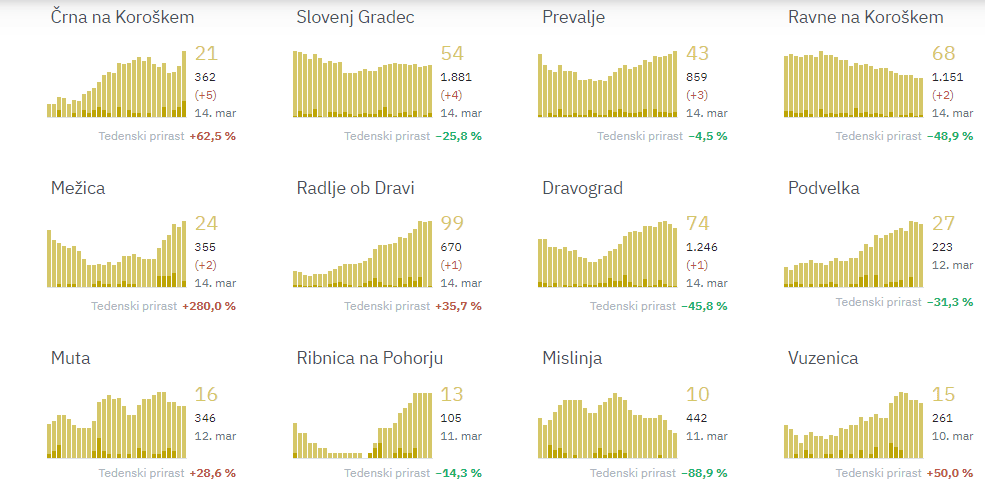 Skupno so v dvanajstih koroških občinah do 14. marca 2021 potrdili 7.901 okužb s covidom-19.