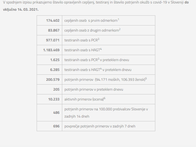 V spodnji tabeli si lahko ogledate število opravljenih cepljenje, testiran in število potrjenih okužb v Sloveniji do vključno 14. 3. 2021:
