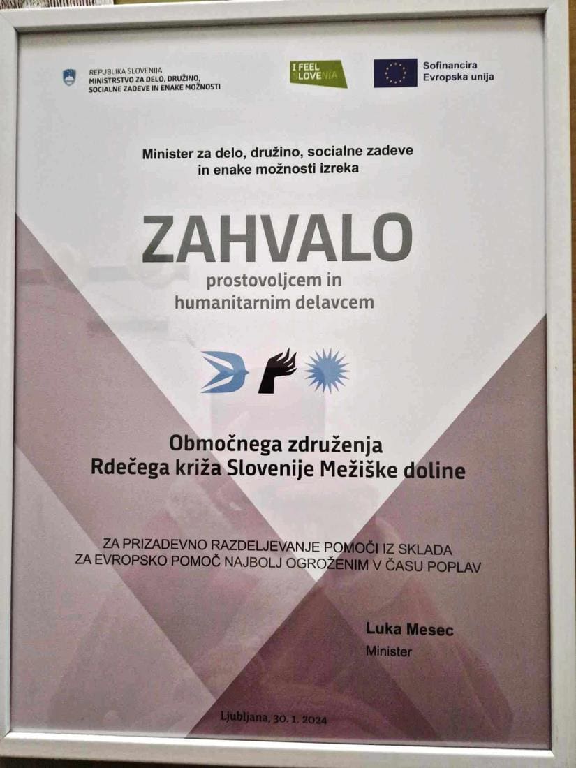 Na Območnem združenju Rdečega križa Dravograd so ob prejemu priznanja takole zapisali: "Minister za delo , družino ,socialne zadeve Luka Mesec je povabi na Brdo pri Kranju vse prostovoljce in prostovoljke, kateri so pomagali oškodovancem pri poplavah v avgustu 2023, ter odpravljanju, razdeljevanju materialne pomoči v Sloveniji iz Programa ESS. Minister je podelil priznanja torej naši organizaciji v zahvalo za nesebično pomoč, pomoč ljudem ljudem v stiski, ali so to elementarne nesreče, ali socialna stiska. Tako ni bil izpostavljen posameznik, ker je pomoč nudilo v poplavah 15 prostovoljcev cela dva meseca, ter 20 prostovoljcev pri mesečnem razdeljevanju hrane iz programa ESS. "