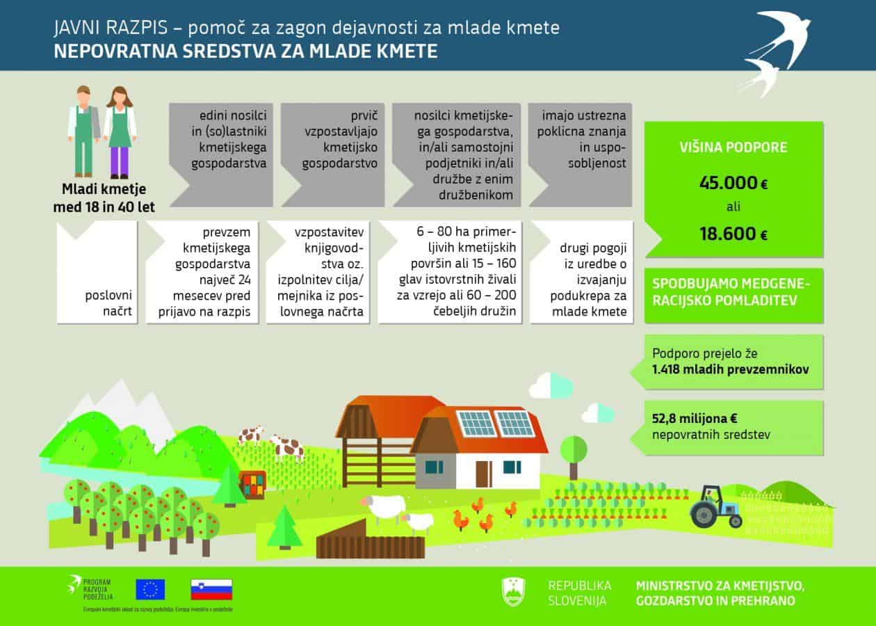 Predmet javnega razpisa je podpora mladim kmetom za vzpostavitev kmetijskega gospodarstva in kmetijske dejavnosti. Upravičenci za podporo so mladi kmetje, stari od 18 do vključno 40 let, ki imajo ustrezno poklicno znanje in usposobljenost. Podpora se dodeli kot pavšalna pomoč v obliki nepovratne finančne pomoči, izplača se v dveh obrokih.