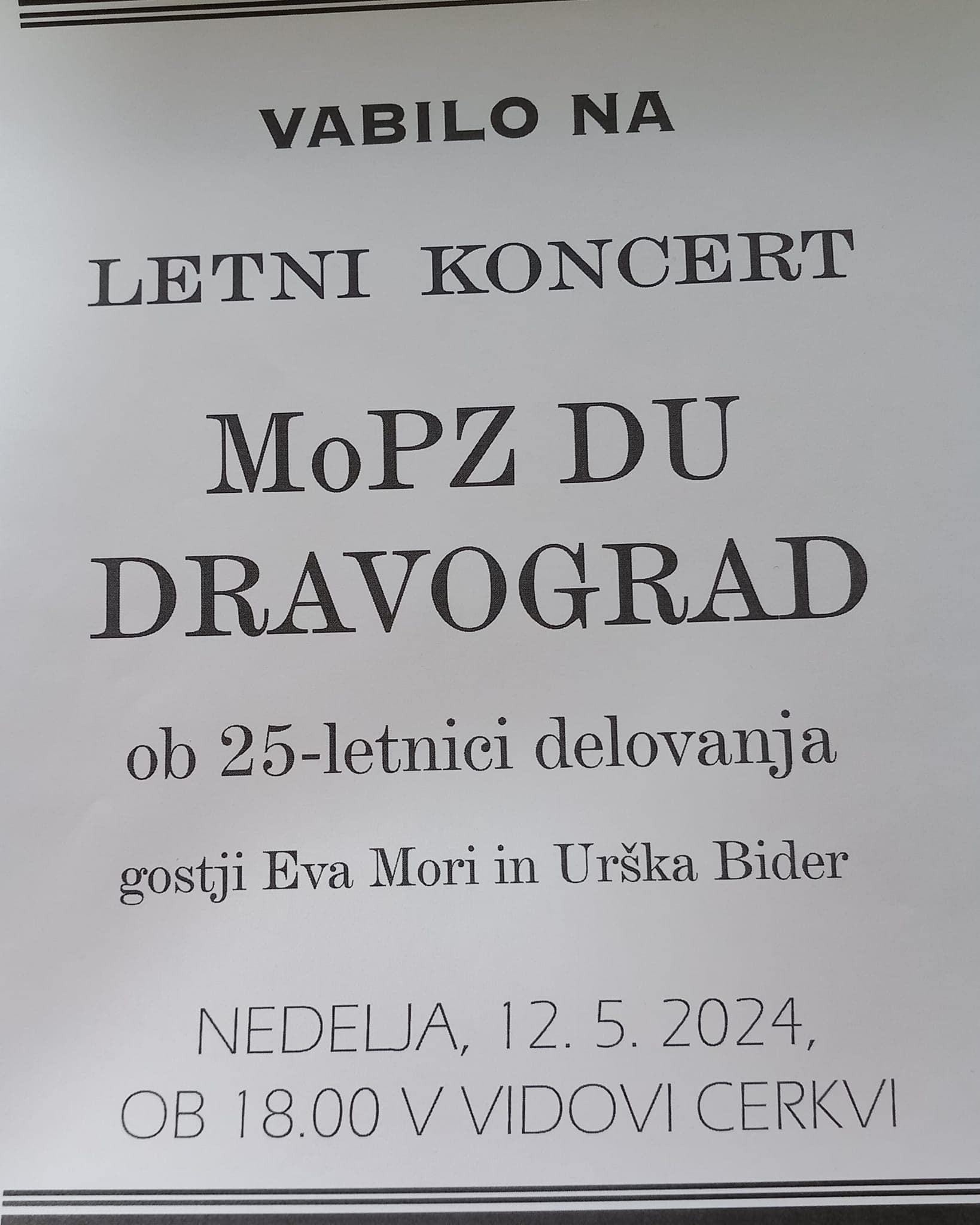 V nedeljo, 12. maja 2024, ob 18. uri se bo v Vidovi cerkvi Dravograd odvijal koncert MoPZ DU Dravograd, saj praznujejo 25. let svojega delovanja.