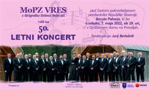 Moški pevski zbor Vres s Prevalj pod vodstvom Helene Buhvald vljudno vabi na svoj 50. letni koncert to soboto, 7. maja, ob 19. uri, v Družbenem domu na Prevaljah.