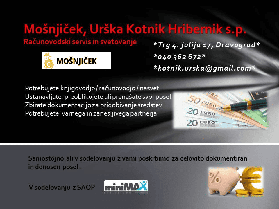 Podjetje Mošnjiček, Urška Kotnik Hribernik s.p., vam ponuja širok nabor storitev na področju knjigovodstva in računovodstva, prilagojenih potrebam gospodarskih družb, samostojnih podjetnikov, posameznikov, društev in kmetov. Z več kot 15 leti izkušenj, so postali zanesljiv partner v vodenju finančnih zadev vašega poslovanja.