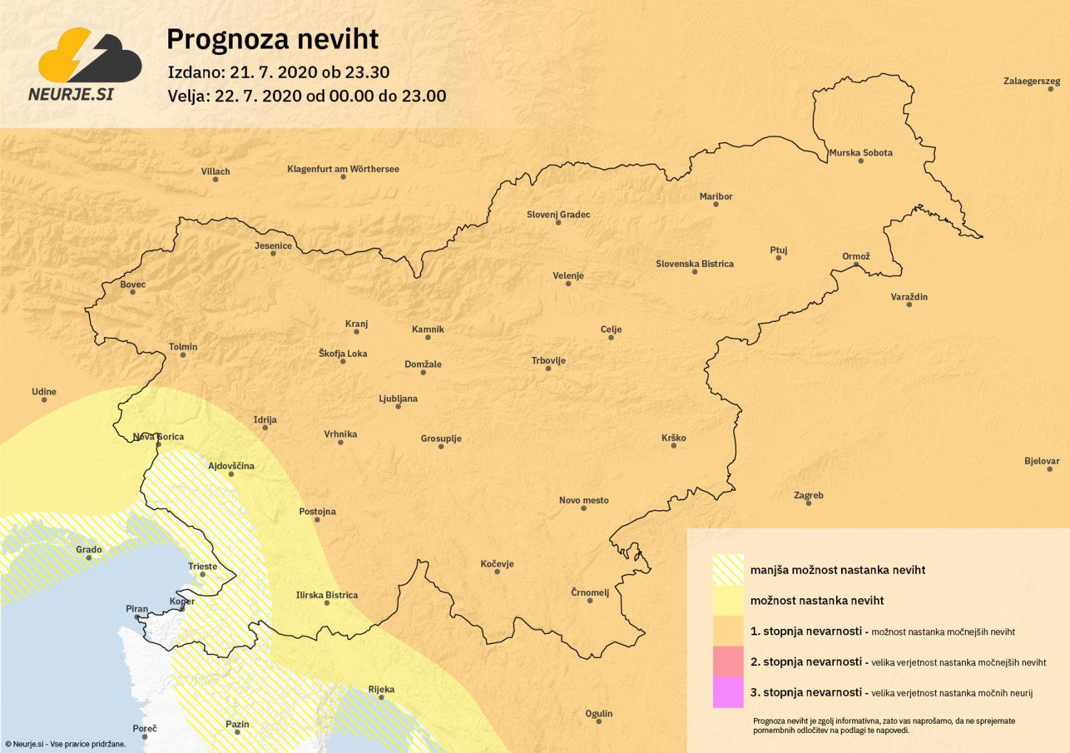 Opozorilo: Popoldne in zvečer bodo predvsem v severozahodni, osrednji in jugovzhodni Sloveniji nastajale močnejše nevihte z nalivi, možen bo tudi pojav toče in močnih sunkov vetra. Ni izključen razvoj superceličnih neviht. Toča lahko, ob dovolj razvitih nevihtah, v premeru, lokalno preseže debelino 4 cm. Na območjih, ki jih bodo v sredo zadele močnejše nevihtne celice, lahko prihaja do hitrega porasta in poplavljanja hudourniških vodotokov. Močnejši sunki nevihtnega piša lahko lokalno, ob močnih nevihtah, podirajo drevesa, lomijo veje in prevračajo nepritrjene predmete. Možna je tudi toča, ki lahko lokalno povzroči večjo škodo na vrtninah in poljščinah.