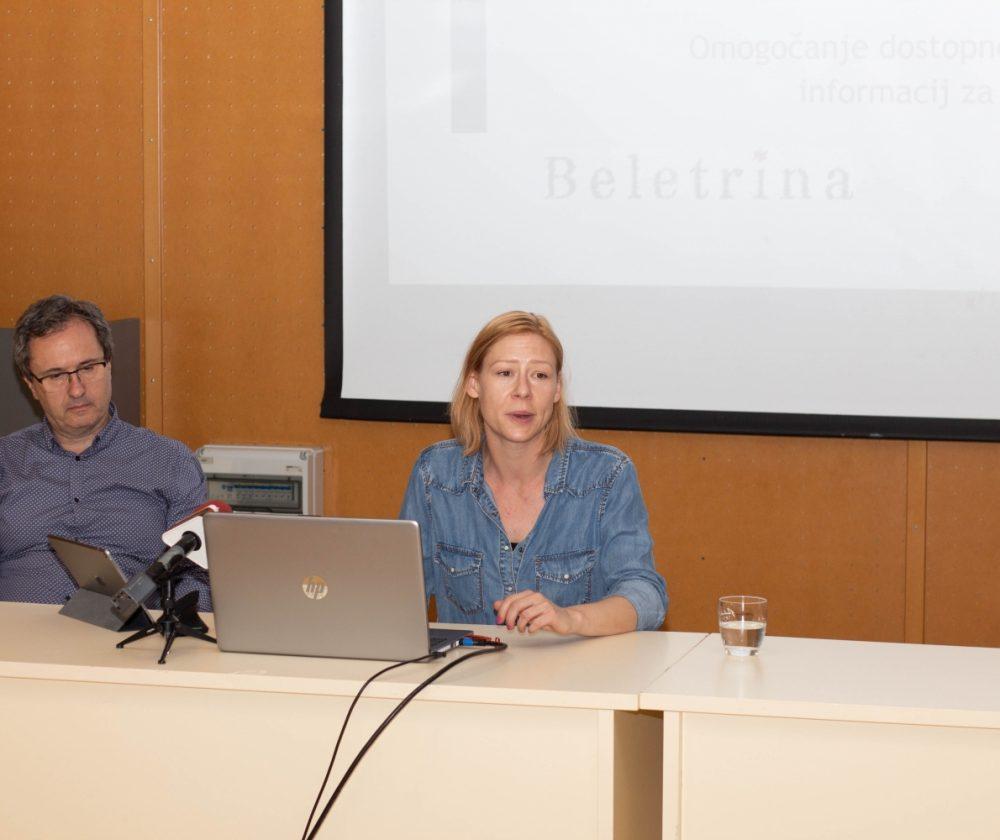 Na srečanju so predstavili tudi projekt spletna dostopnost, s katero se Beletrina ukvarja že od leta 2011. Zakon o dostopnosti spletišč, ki je bil sprejet v lanskem letu, namreč zavezuje javne organe v Sloveniji, da omogočijo spletno dostopnost vsem, predvsem ljudem z različnimi invalidnostmi, na primer slepim, slabovidnim in gibalno oviranim. Kar praktično pomeni, da morajo svoja spletišča temu prilagoditi. Beletrina je, tudi na podlagi izkušenj uporabnikov in v sodelovanju z Nacionalnim svetom invalidskih organizacij Slovenije, oblikovala enotno metodologijo prilagajanja dostopnosti po zgledu uveljavljenih mednarodnih praks in priporočil za dostopnost spletnih vsebin WCAG 2.0., ki jo lahko za prilagajanje svojih spletišč uporabijo k spletni dostopnosti zavezani javni zavodi.