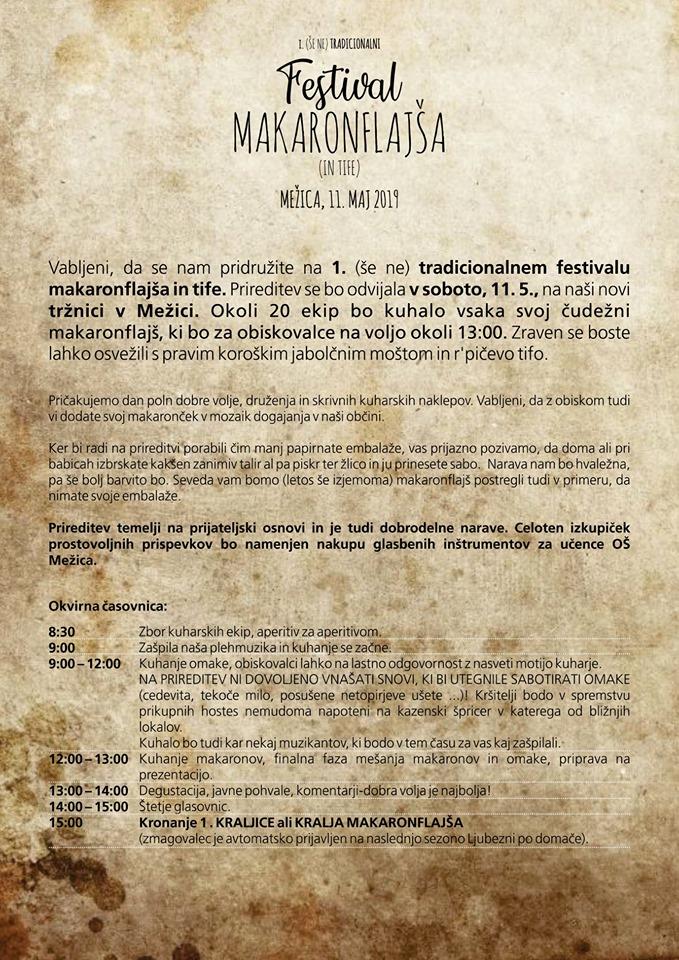 Vabljeni, da se pridružite dogajanju, ki bo potekalo na mežiški tržnici med 8.30 in 15. uro, ko bodo okronali prvo kraljico ali kralja makaronflajša.