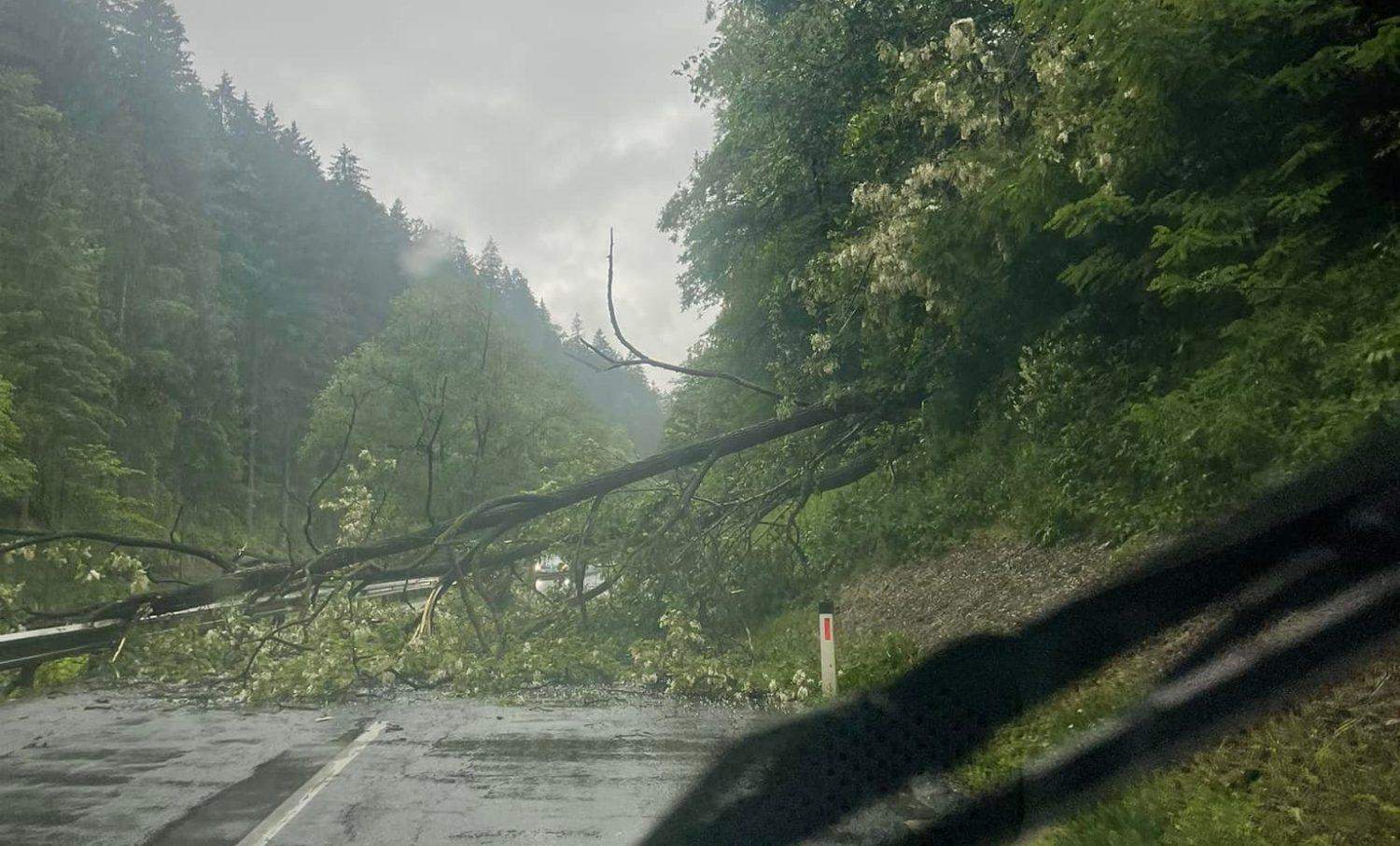 Ob 15.31 sta se na glavno cesto relacije Dravograd - Ravne na Koroškem v naselju Podklanc, občina Dravograd, podrli dve drevesi. Odstranili so ju gasilci PGD Črneče.