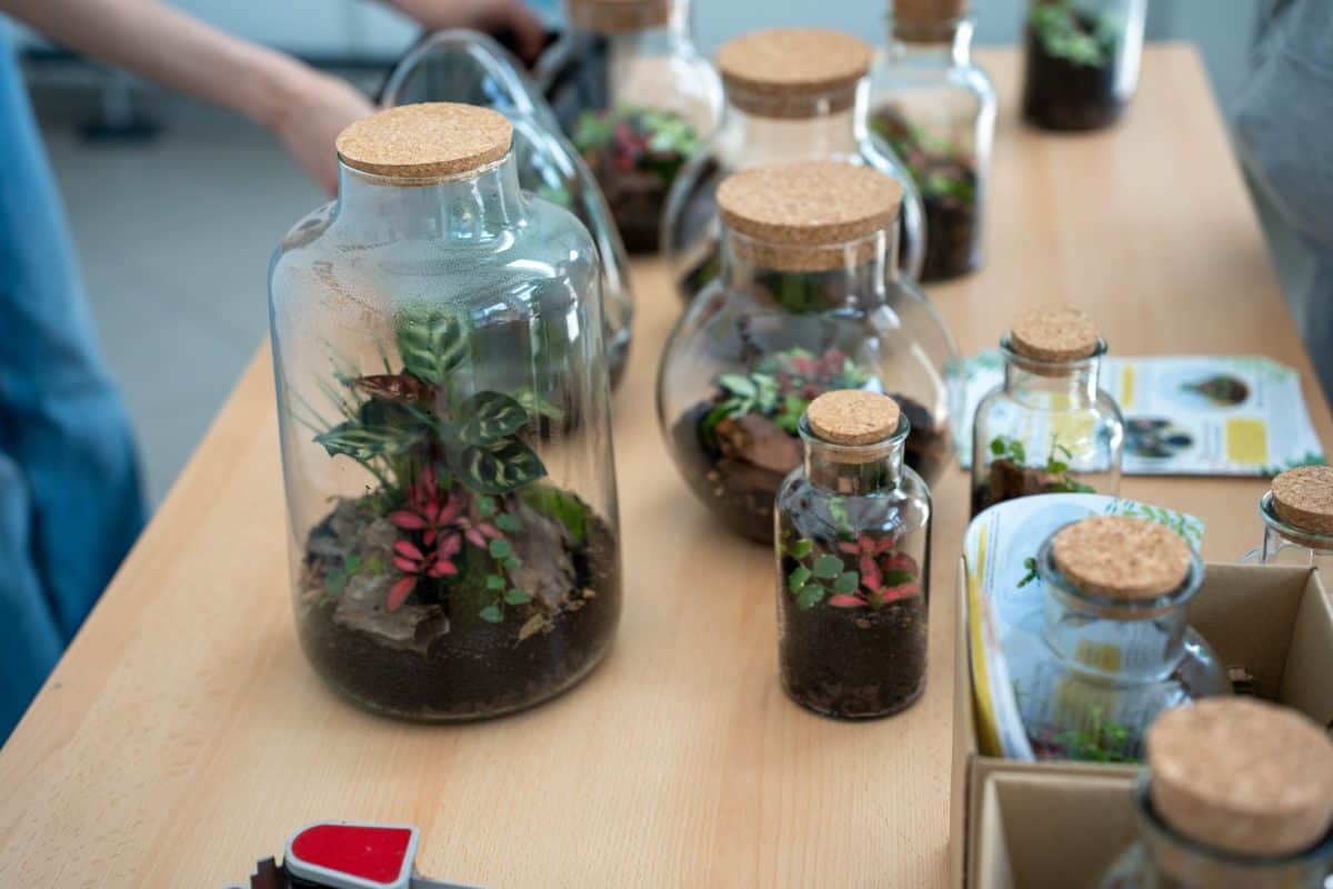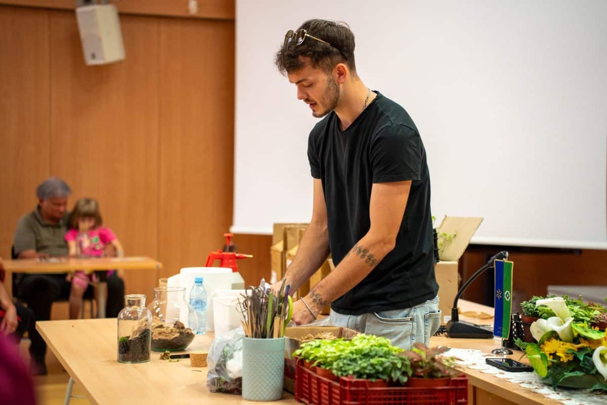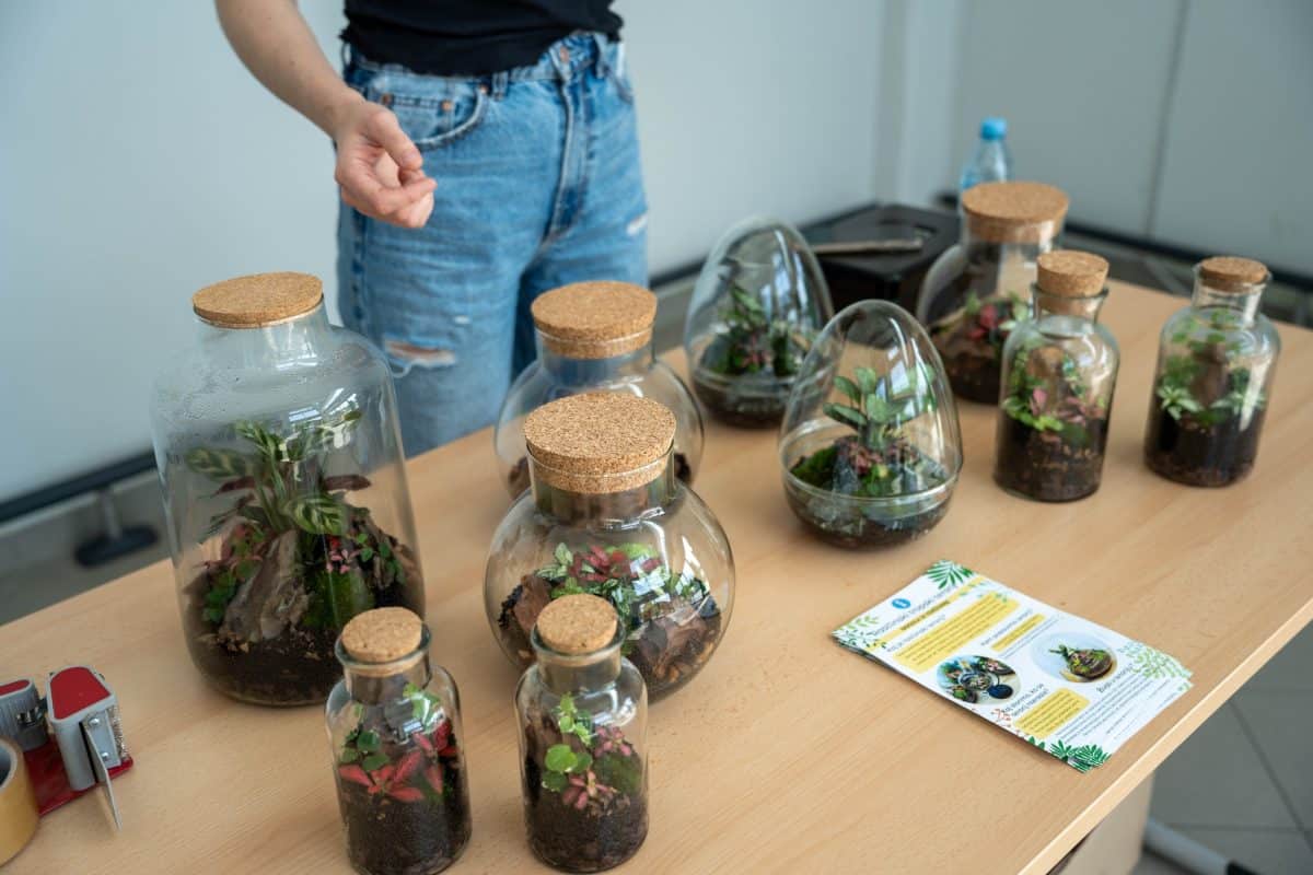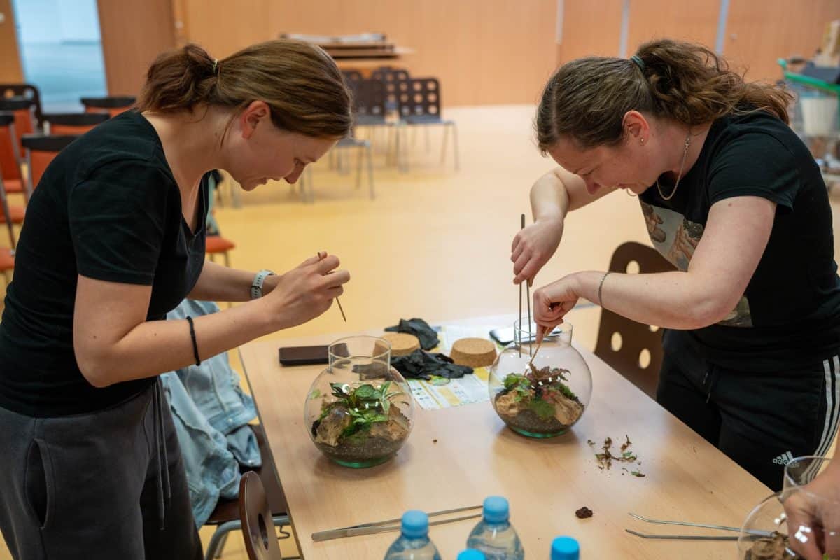 Po teoretičnem delu delavnice pa je bil na vrsti praktični del, kjer so si sodelujoči na delavnici ustvarili čisto svoj rastlinski terarij. Pod Mihovim budnim očesom so sodelujoči v posode nasuli drenažo, posebno prst za tropikarije in tako pripravili podlago, na katero so potem zasadili rastline. Pri vsem tem so morali biti še posebej pozorni na rokovanje z nežnimi, drobnimi rastlinami, da jih niso preveč stisnili ali poškodovali. Vsak od prisotnih si je sam izbral, katere rastline bo vključil v svoj tropikarij, Miha pa je s seboj na delavnico pripeljal velik nabor različnih krasnih rastlin - od raznobarvnih fitonij, kriptantusa, vzpenjavega fikusa, kalateje, mahu, ... Miha jim je bil med ustvarjanjem ves čas na voljo in odgovarjal na vprašanja, prav tako pa je priskočil na pomoč, če kaj ni bilo jasno.