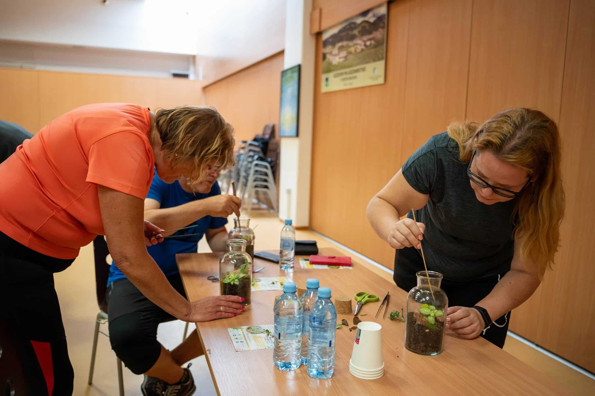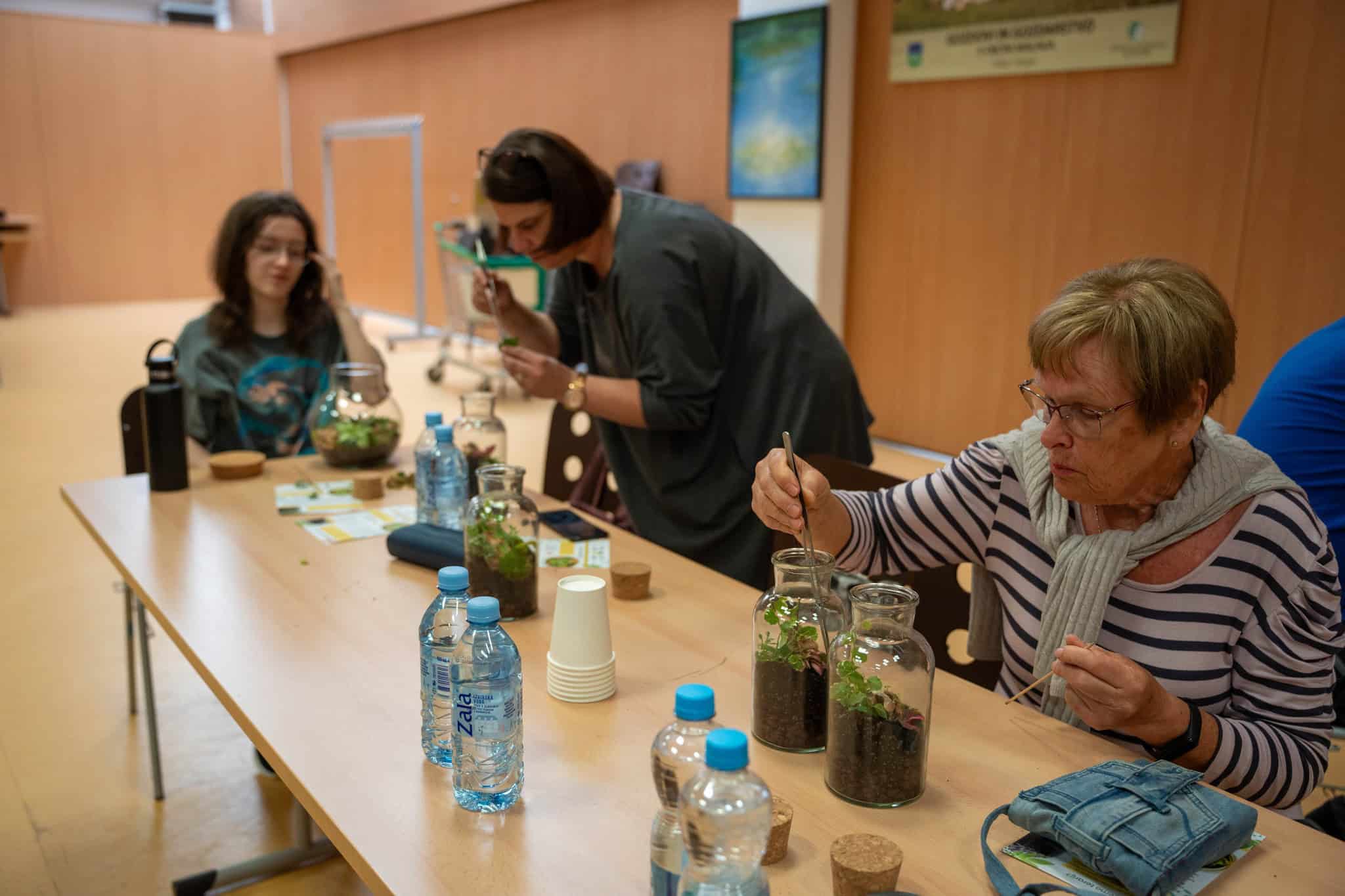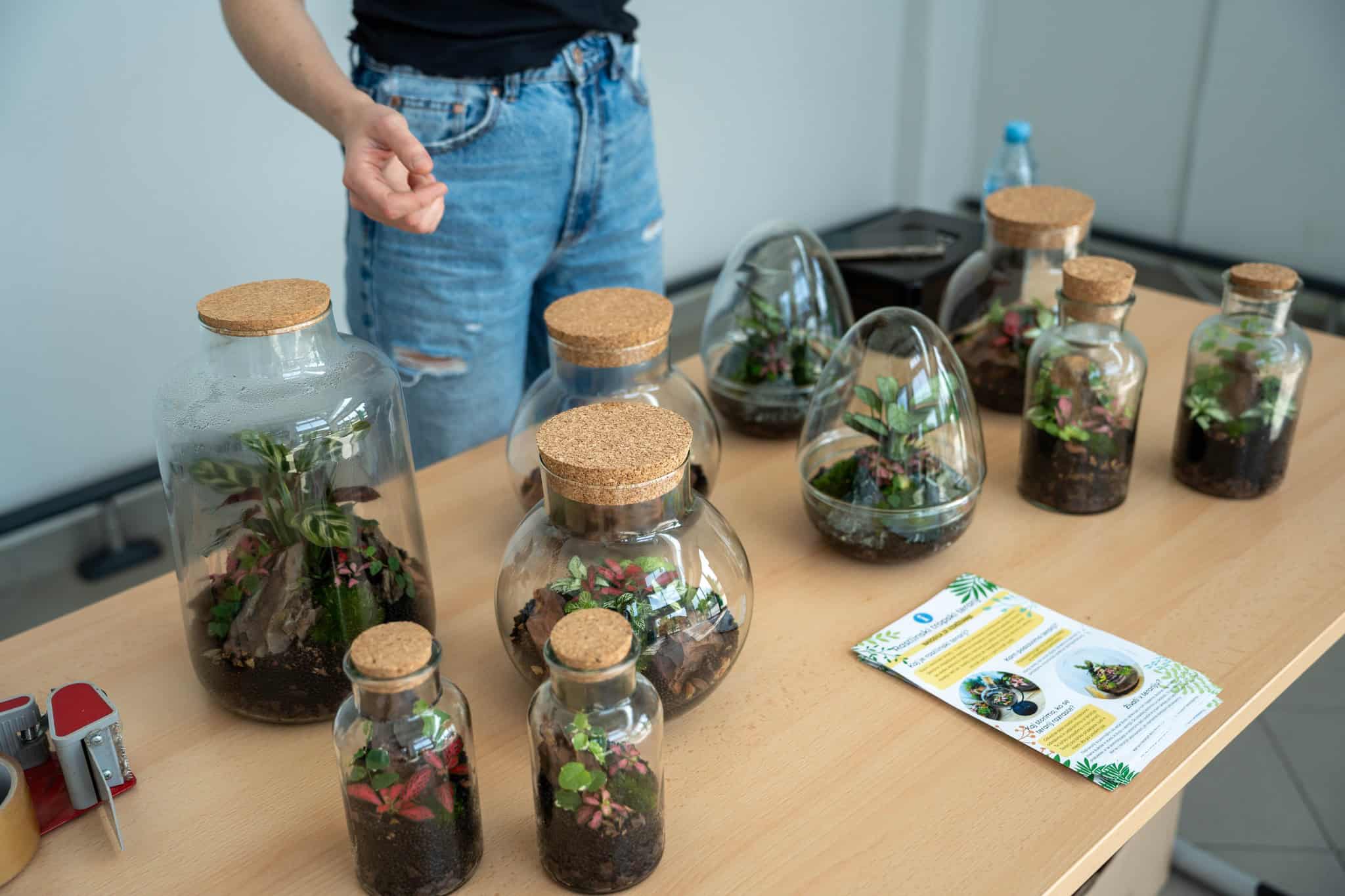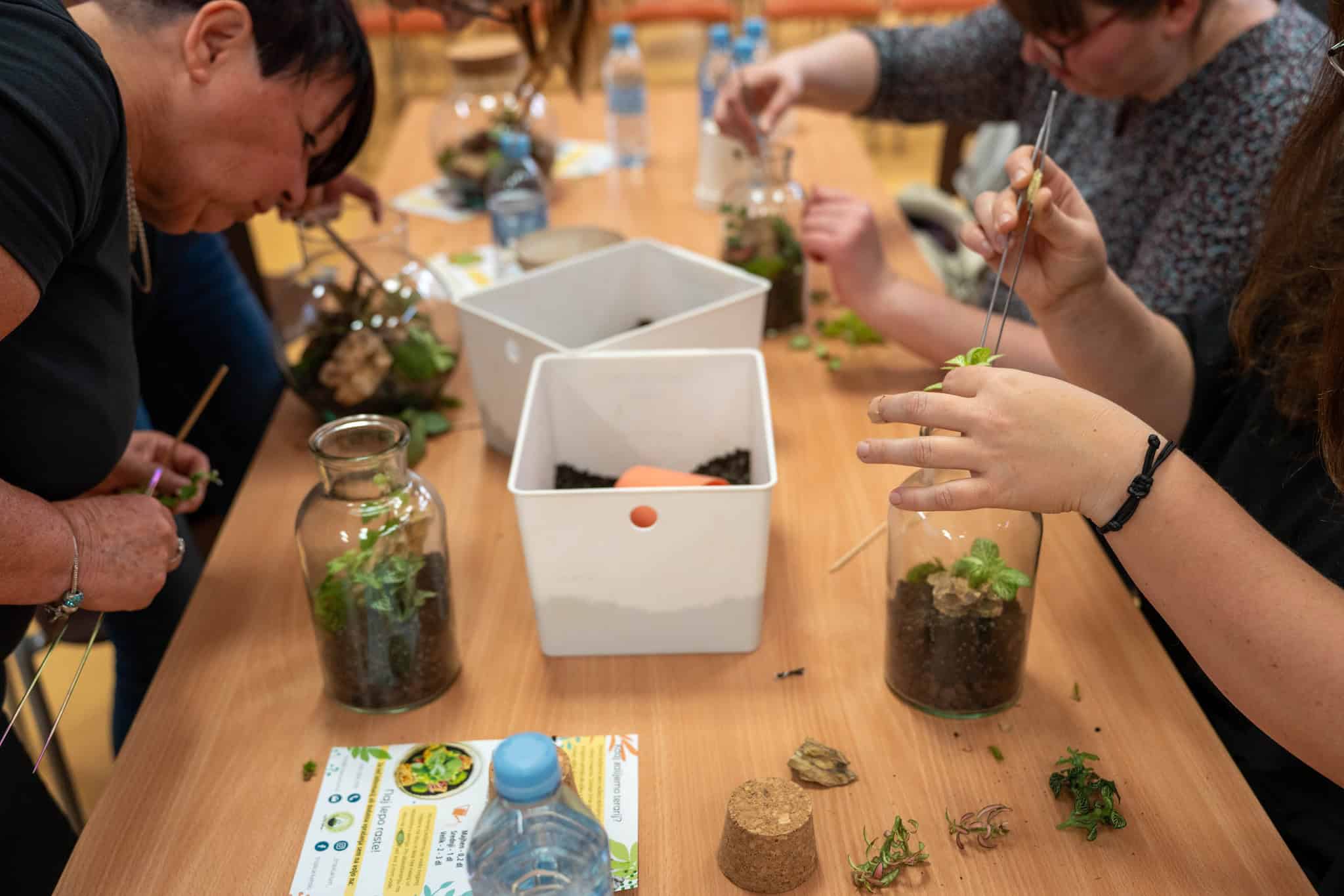 Po teoretičnem delu delavnice pa je bil na vrsti praktični del, kjer so si sodelujoči na delavnici ustvarili čisto svoj rastlinski terarij. Pod Mihovim budnim očesom so sodelujoči v posode nasuli drenažo, posebno prst za tropikarije in tako pripravili podlago, na katero so potem zasadili rastline. Pri vsem tem so morali biti še posebej pozorni na rokovanje z nežnimi, drobnimi rastlinami, da jih niso preveč stisnili ali poškodovali. Vsak od prisotnih si je sam izbral, katere rastline bo vključil v svoj tropikarij, Miha pa je s seboj na delavnico pripeljal velik nabor različnih krasnih rastlin - od raznobarvnih fitonij, kriptantusa, vzpenjavega fikusa, kalateje, mahu, ... Miha jim je bil med ustvarjanjem ves čas na voljo in odgovarjal na vprašanja, prav tako pa je priskočil na pomoč, če kaj ni bilo jasno.