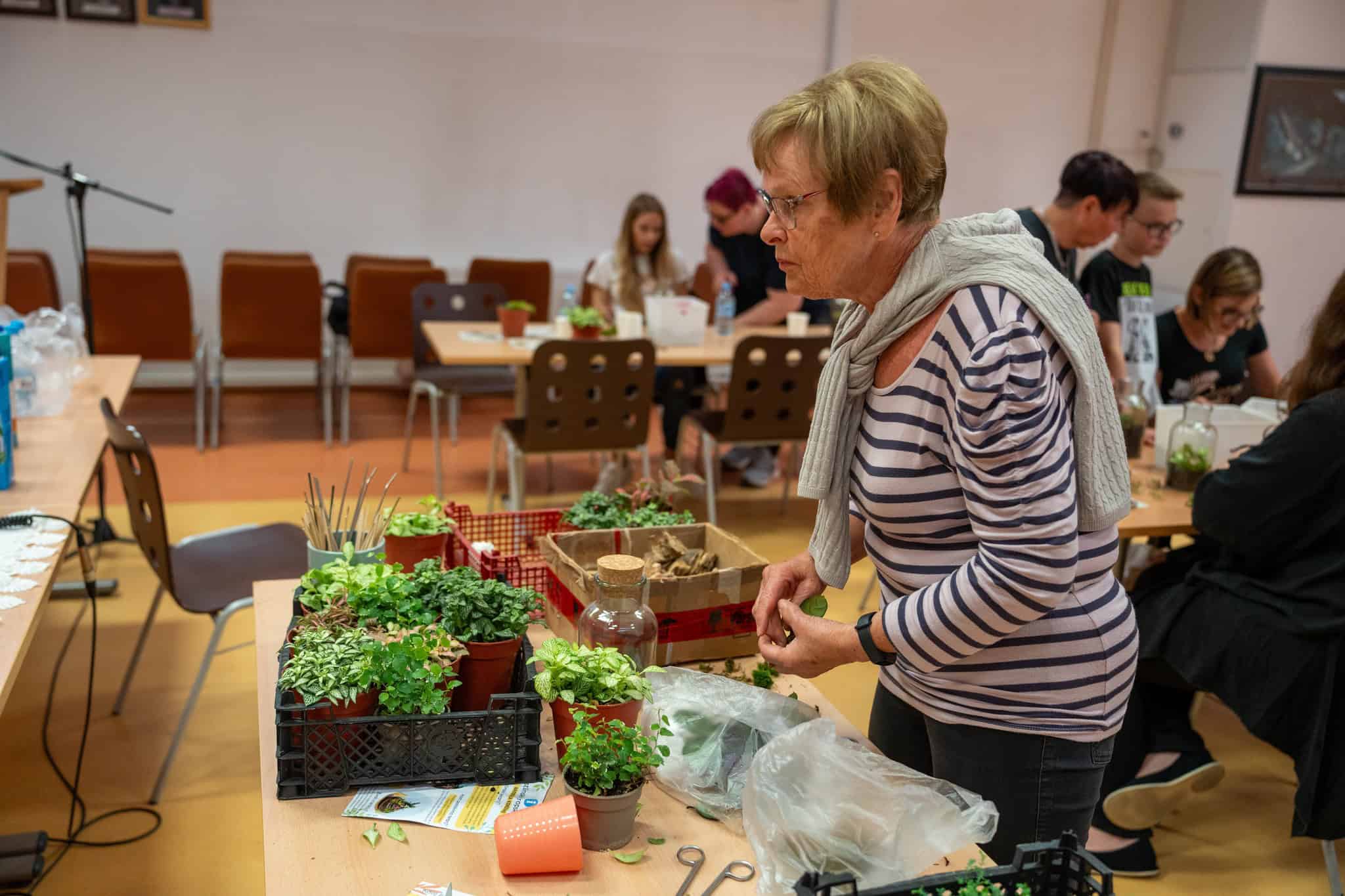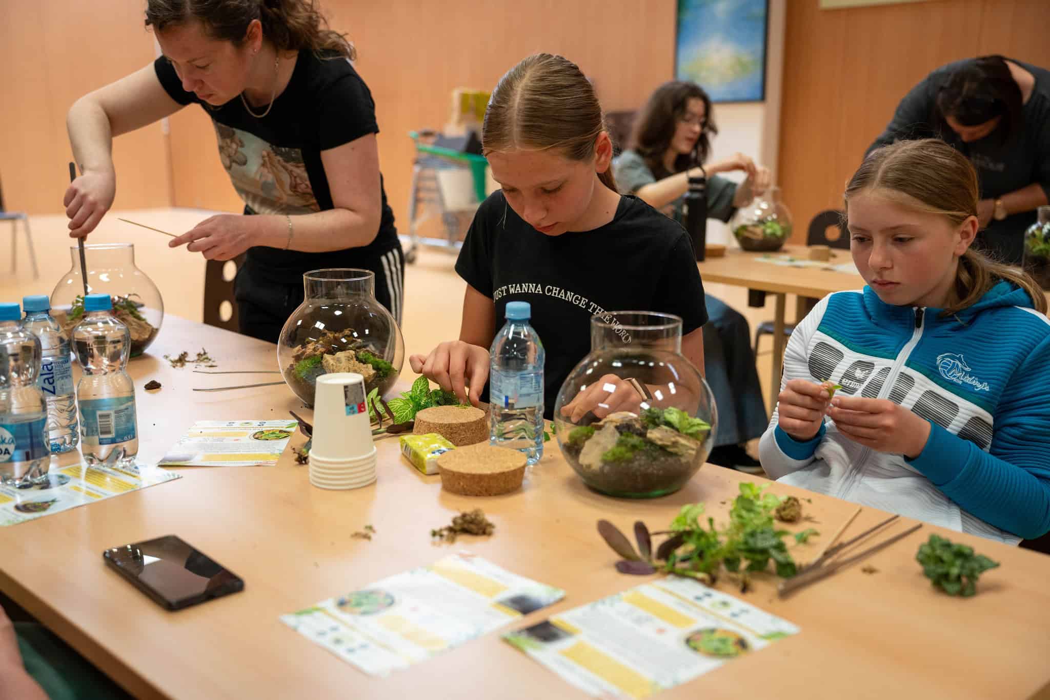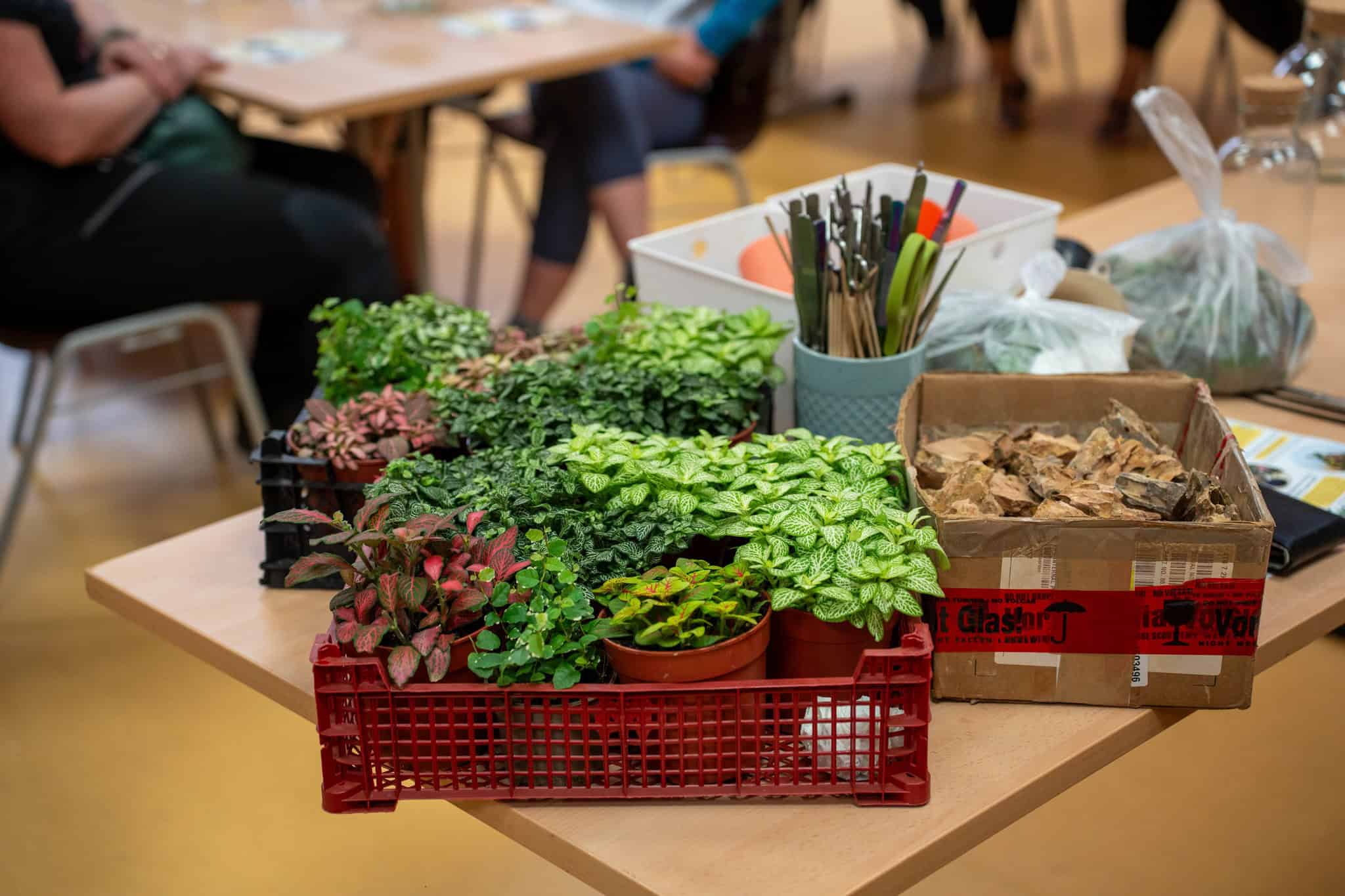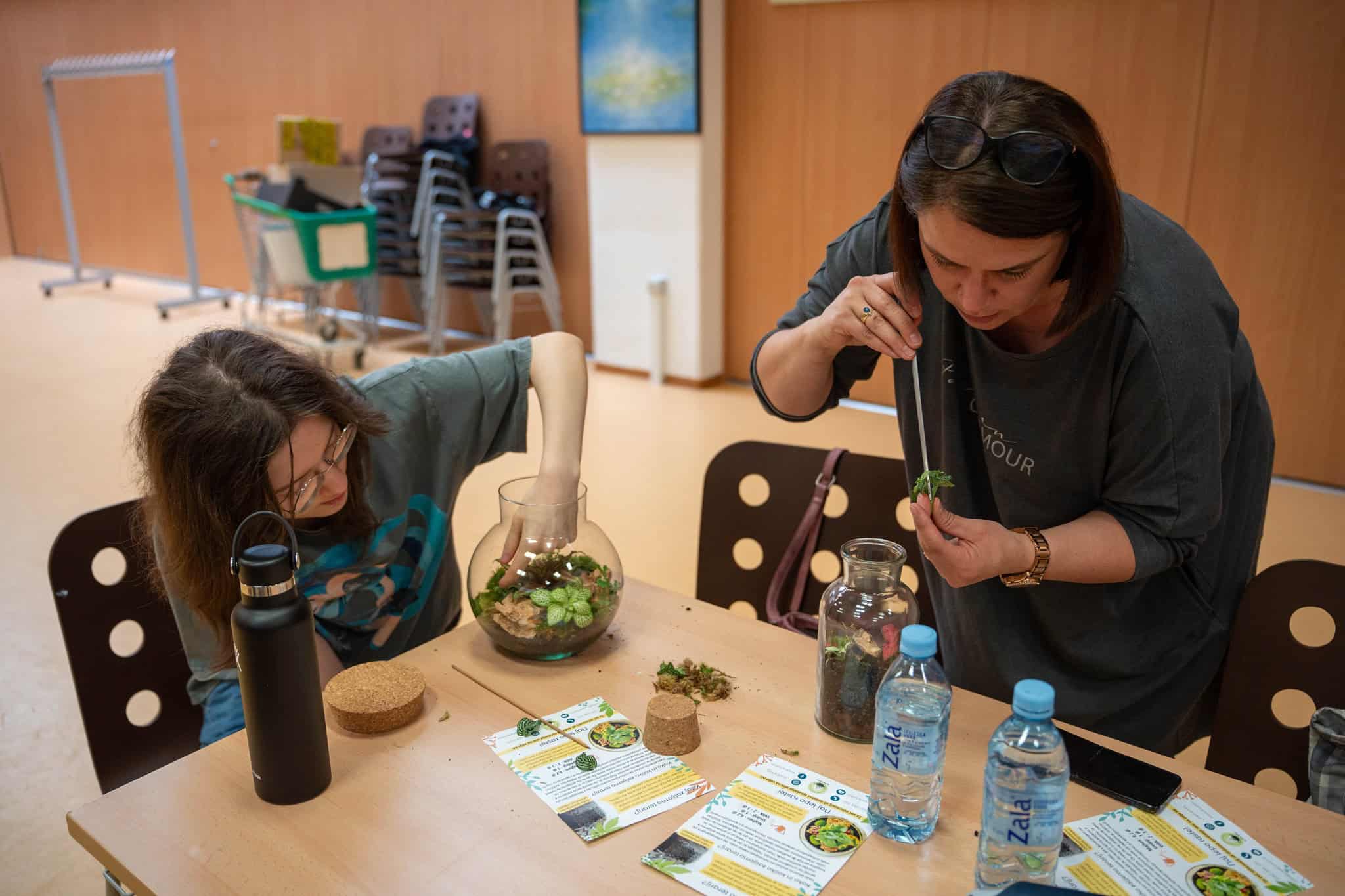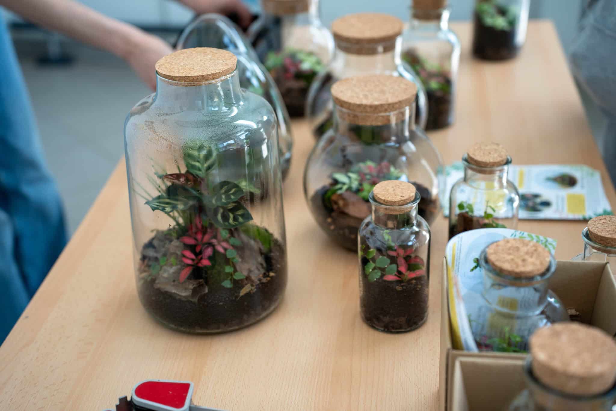 Po teoretičnem delu delavnice pa je bil na vrsti praktični del, kjer so si sodelujoči na delavnici ustvarili čisto svoj rastlinski terarij. Pod Mihovim budnim očesom so sodelujoči v posode nasuli drenažo, posebno prst za tropikarije in tako pripravili podlago, na katero so potem zasadili rastline. Pri vsem tem so morali biti še posebej pozorni na rokovanje z nežnimi, drobnimi rastlinami, da jih niso preveč stisnili ali poškodovali. Vsak od prisotnih si je sam izbral, katere rastline bo vključil v svoj tropikarij, Miha pa je s seboj na delavnico pripeljal velik nabor različnih krasnih rastlin - od raznobarvnih fitonij, kriptantusa, vzpenjavega fikusa, kalateje, mahu, ... Miha jim je bil med ustvarjanjem ves čas na voljo in odgovarjal na vprašanja, prav tako pa je priskočil na pomoč, če kaj ni bilo jasno.