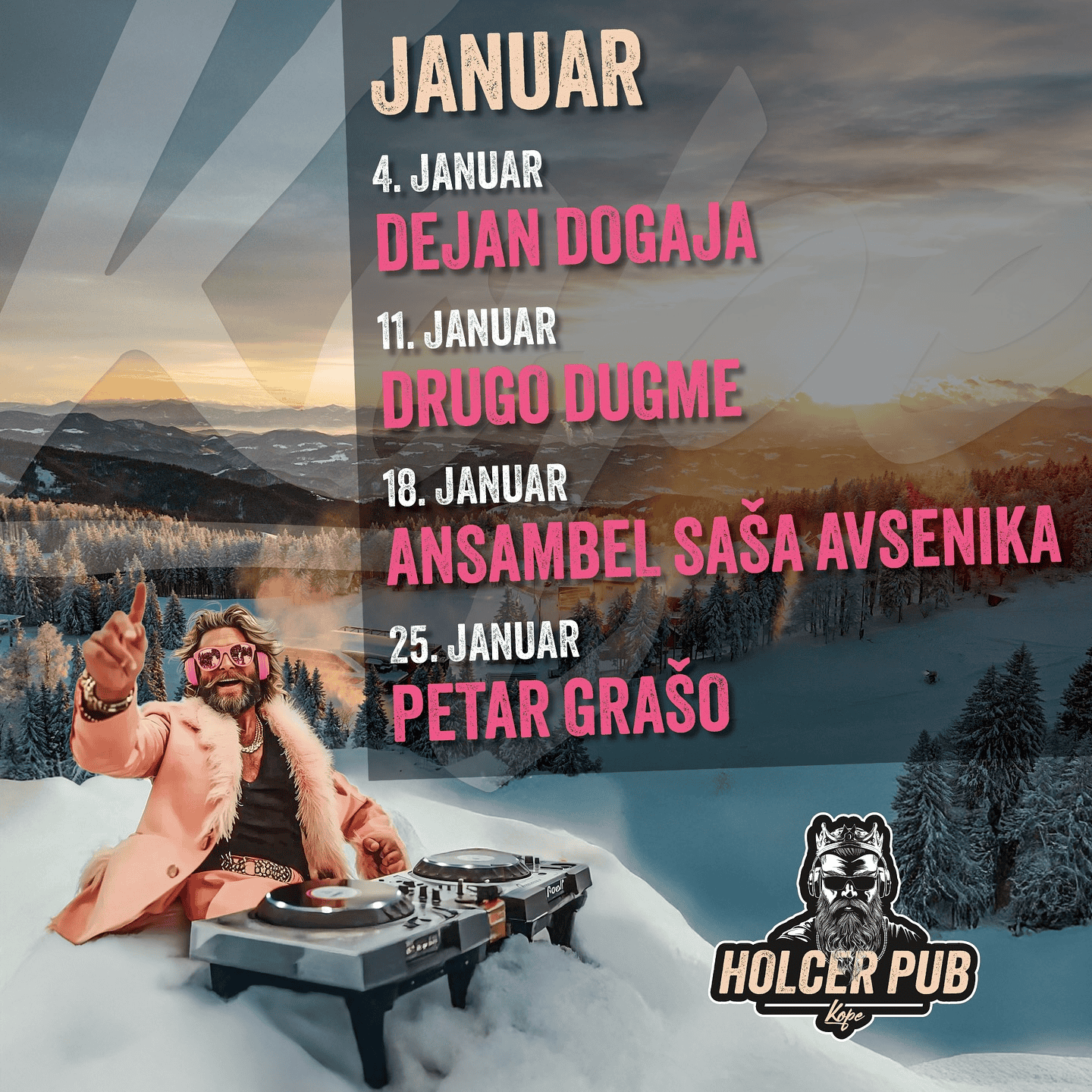 Za nepozabne žure v Holcer Pubu pa bodo skozi cel januar poskrbeli odlični glasbeni gostje Drugo Dugme, Ansambel Saša Avsenika ter nepozabni Petar Grašo.