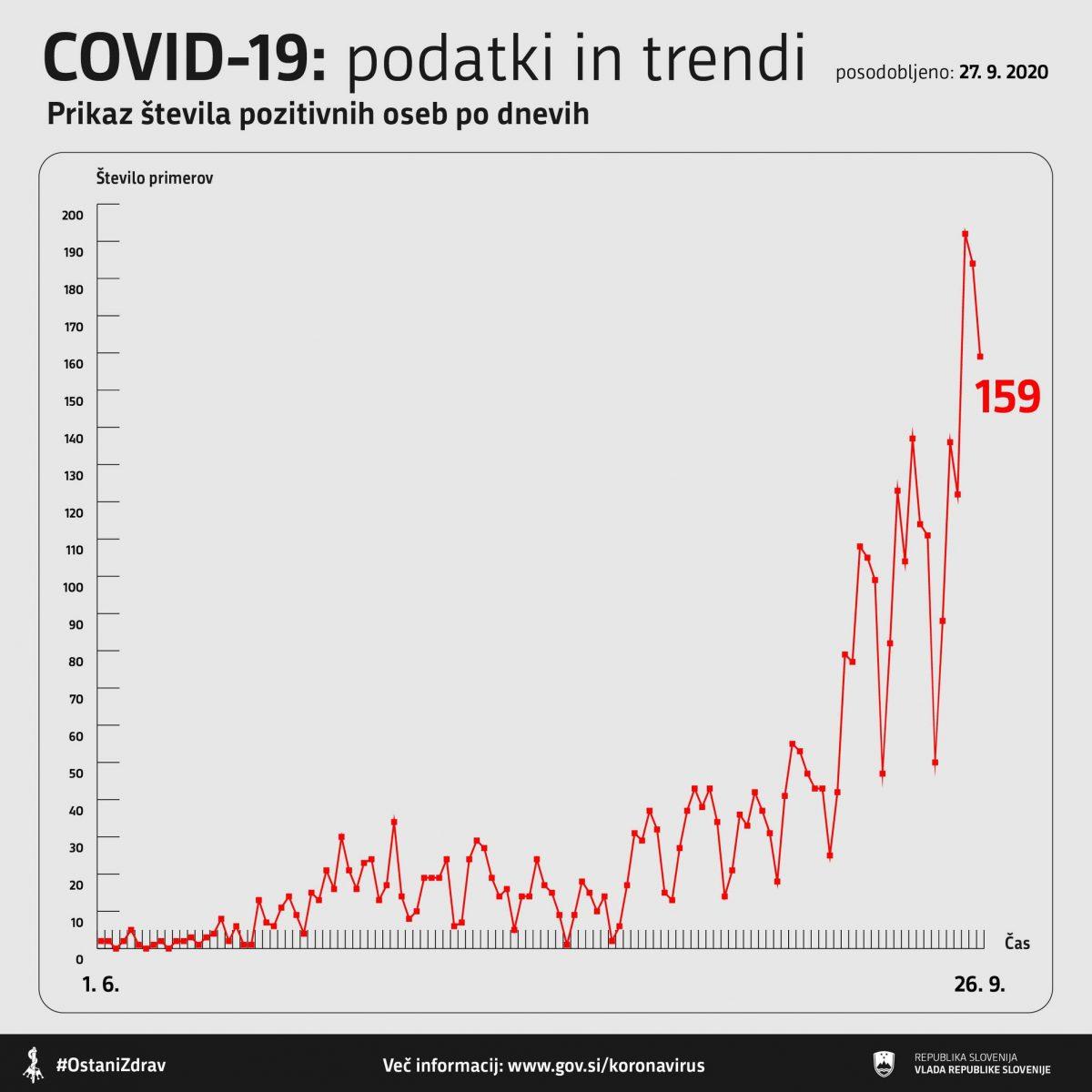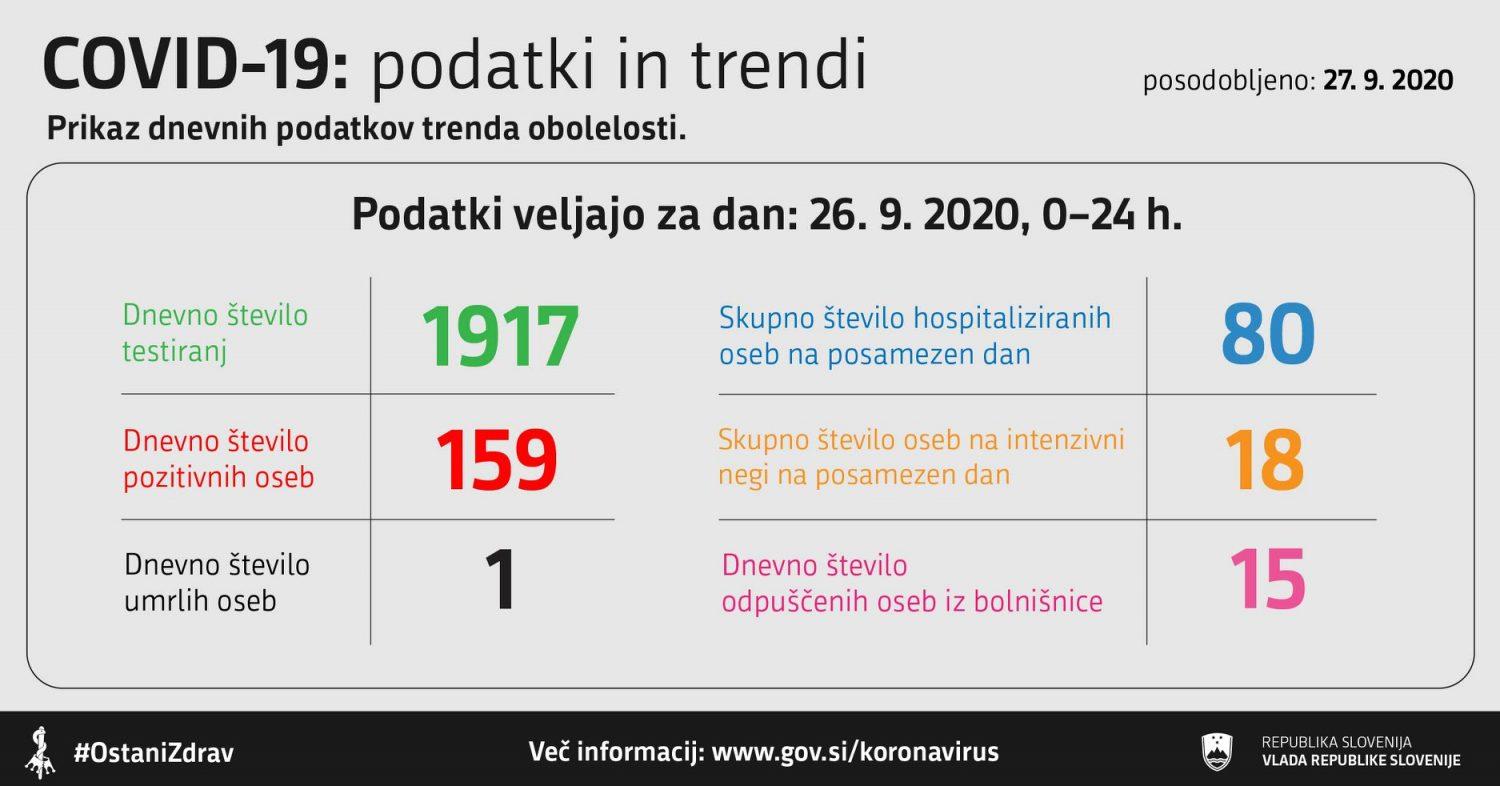 V soboto so v Sloveniji ob 1917 testih potrdili 159 okužb z novim koronavirusom, je vlada objavila na Twitterju. V bolnišnicah zdravijo 80 bolnikov s covidom-19, 18 na intenzivni negi, en bolnik je umrl. Iz bolnišnic so v soboto odpustili 15 bolnikov s covidom-19. V državi je trenutno 1648 aktivnih okužb, kažejo podatki Sledilnika za covid-19. Nove okužbe so v soboto zabeležili v 64 različnih občinah, ena pa je iz tujine.