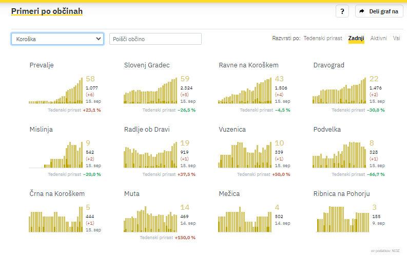 V zadnjih dveh tednih so v Sloveniji potrdili 562 okužb na 100.000 prebivalcev, povprečje v zadnjih sedmih dneh pa je 997. Po oceni NIJZ je v državi trenutno 11.889 aktivnih primerov okužbe, po podatkih sledilnika za Covid-19 jih je na Koroškem 254.