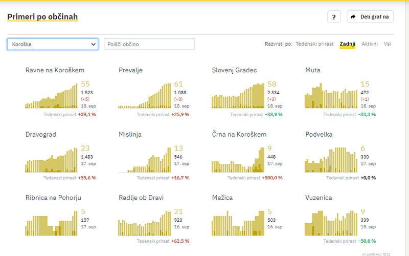 Na Koroškem so v soboto potrdili 12 novih okužb. Največ na Ravnah, kjer so jih zabeležili 5, na Prevaljah 3, v Slovenj Gradcu 3, na Muti pa 1. Po oceni NIJZ je v državi trenutno 13.155 aktivnih primerov okužbe, na Koroškem 280. Največ aktivnih okužb je na Prevaljah (61), v Slovenj Gradcu jih beležijo 58, na Ravnah pa 55.