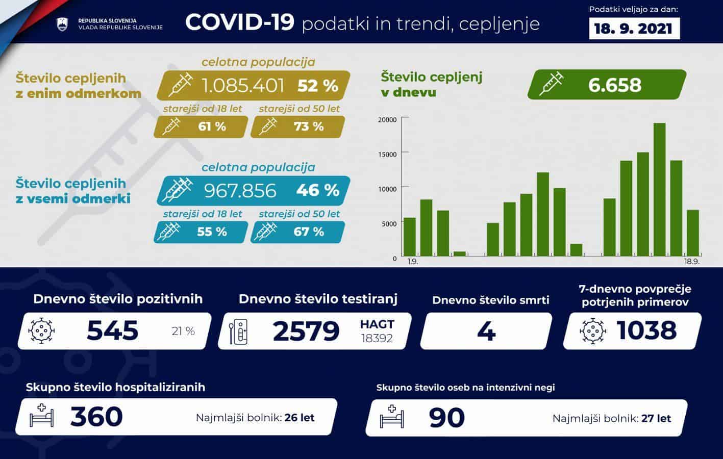 V bolnišnicah je hospitaliziranih 360 oseb s covidom-19, kar je enako kot dan prej, od tega 90 na intenzivni negi oz. eden manj kot dan prej. Najmlajši bolnik s covidom-19 na intenzivnem oddelku je star 27 let. V soboto so umrle štiri osebe s covidom-19.