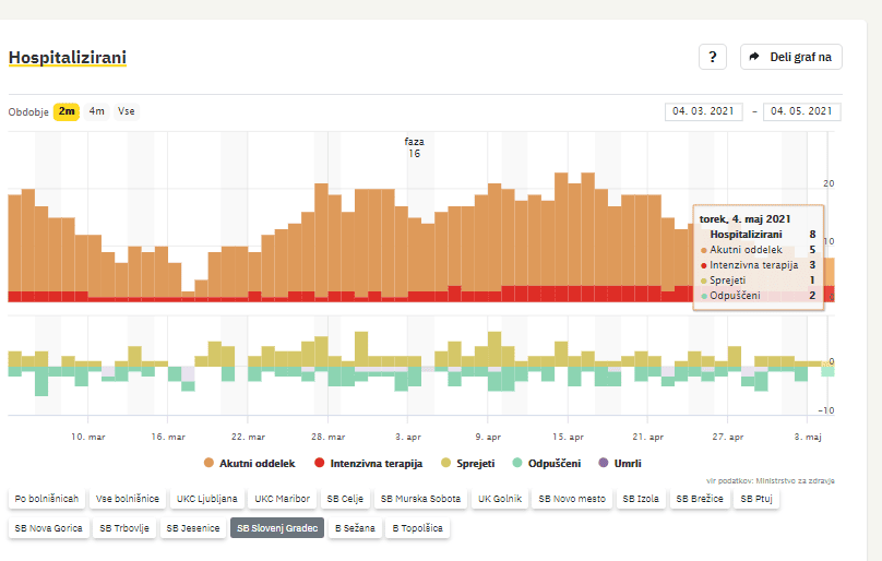 V Splošni bolnišnici Slovenj Gradec se po zadnjih podatkih Covid-19 sledilnika zdravi 8 covidnih bolnikov, trije na oddelku intenzivne terapije. V bolnišnično oskrbo so sprejeli eno osebo, v domačo oskrbo pa odpustili dve osebi s potrjeno okužbo. Umrl ni nihče.
