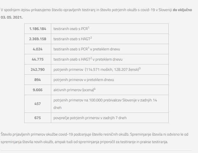 Število opravljenih testiranj in število potrjenih okužb s covidom-19 do vključno 3. 5. 2021.