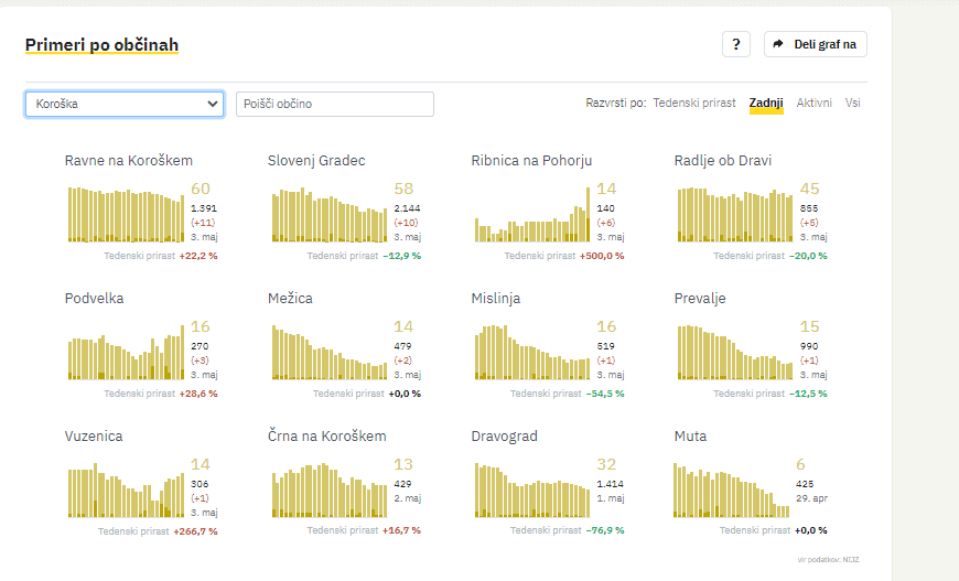 Ravne na Koroškem 11, Slovenj Gradec 10, Ribnica na Pohorju 6, Radlje ob Dravi 5, Podvelka 3, Mežica 2, Mislinja 1, Prevalje 1, Vuzenica 1.
