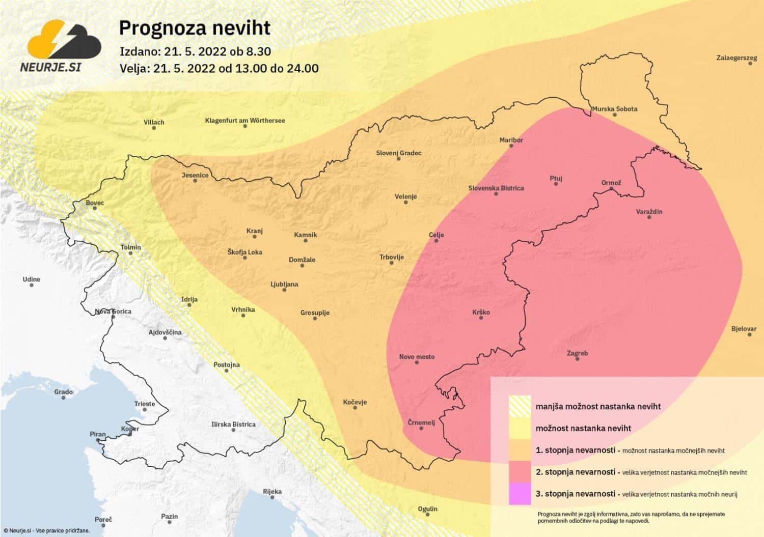 Te se bodo sprva začele pojavljati na Koroškem, Štajerskem in v Prekmurju, kasneje pa se bodo razširile tudi nad del Gorenjske, osrednje Slovenije in na Dolenjsko. Kakšna nevihta proti večeru ni povsem izključena tudi ob robu Dinarske pregrade, na Notranjskem. Popoldne bodo predvsem v severovzhodni in vzhodni Sloveniji možna krajevna neurja s silovitimi nalivi, močnim nevihtnim pišem in točo, ki bo lahko ob bolje organiziranih nevihtnih celicah (supercelične nevihte) tudi zelo debela. Nevihtne celice bodo potovale v smeri hrvaške meje. Nevihte bodo glede na izračune meteoroloških modelov najmočnejše prav v bližini meje s Hrvaško.