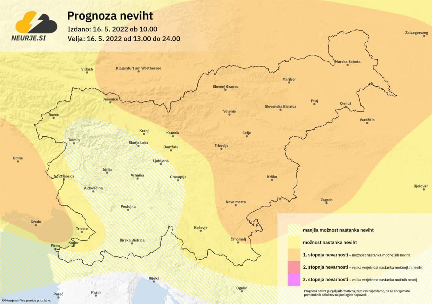 Najmanj verjetnosti za nastanek neviht bo danes v delu osrednje Slovenije in na Notranjskem.
