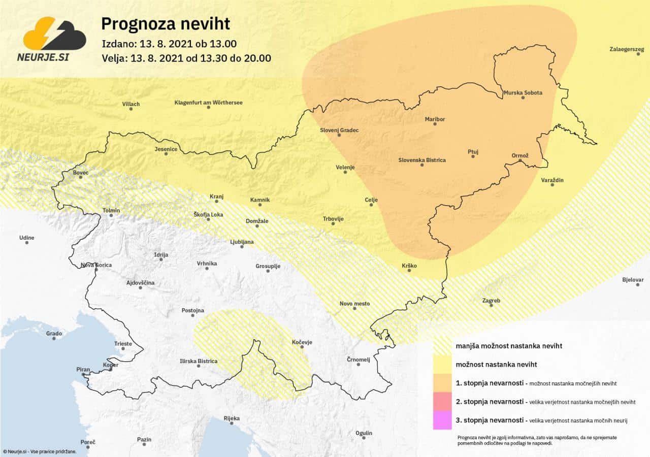 Najvišje dnevne temperature bodo danes od 31 do 34, na Goriškem do 36 °C. Popoldne bodo ponekod v severni Sloveniji iz smeri Avstrije nastale posamezne krajevne nevihte. Predvsem na Koroškem, Štajerskem ali v Pomurju je lokalno možna kakšna močnejša nevihta z močnimi nalivi, sunki nevihtnega piša in točo.