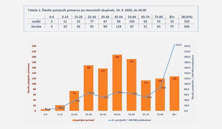 Med COVID-19 pozitivnimi je 532 moških in 656 žensk, skupno 1188 oseb. Pozitivni primeri COVID-19 so po starostnih skupinah predstavljeni v Tabeli 1.