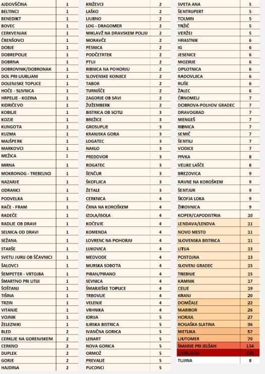 Do 10. 4. 2020 (do 24.00) je bil vsaj en primer okužbe COVID-19 potrjen v 145 občinah (68 % vseh slovenskih občin), več kot dva primera okužbe COVID-19 sta bila potrjena v 102 občinah.