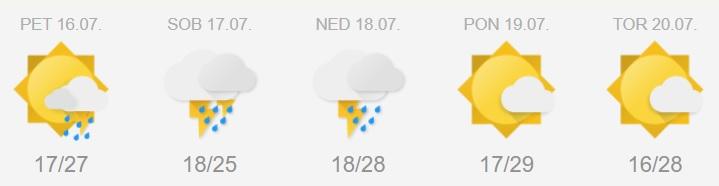 Danes bo oblačno s pogostimi padavinami, deloma plohami in nevihtami. Najvišje dnevne temperature bodo od 22 do 27 °C. Občasno se bodo lahko v vzhodni polovici Slovenije pojavljale tudi krajevne nevihte, ki jih bodo spremljali močnejši, dolgotrajnejši nalivi. Večja verjetnost za nastanek krajevnih neviht bo v popoldanskem času, ko bodo vzhodni vetrovi nad naše kraje prinesli večjo zalogo razpoložljive potencialne konvektivne energije (CAPE). Vrednosti te bodo danes nad severovzhodno Slovenijo dosegle okrog 1000 J/kg.