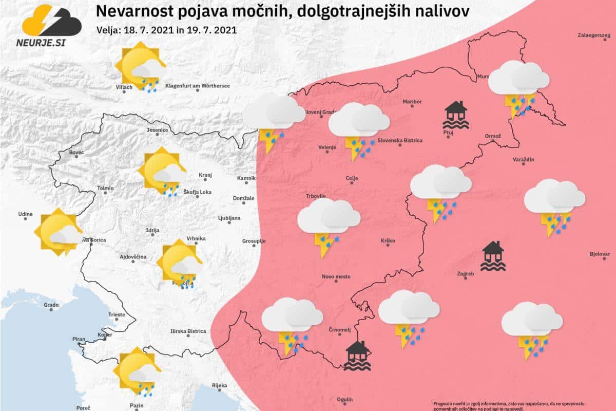 Od danes do vključno nedelje se bodo pojavljale občasne padavine, večinoma lokalne plohe in nevihte. Padavine bodo izrazitejše v vzhodni polovici države. Ponekod se bodo občasno pojavljali močni, dolgotrajnejši nalivi. Pomikanje padavin bo počasno, zato lahko nad lokalnimi območji pade velika količina dežja v razmeroma kratkem času, kar utegne povzročati težave, opozarjajo na spletnem portalu Neurje.si.