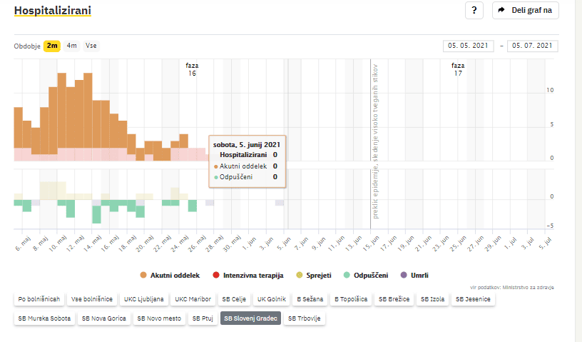 Po zadnjih podatkih Covid-19 sledilnika v Splošni bolnišnici Slovenj Gradec ne zdravijo nobenega covidnega pacienta. Nazadnje so imeli hospitaliziranega bolnika s potrjeno okužbo v soboto, 5. junija 2021.