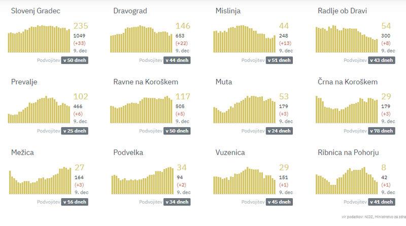 Na Koroškem so največ novih okužb potrdili v Slovenj Gradcu, in sicer 33, v Dravogradu 22, v Mislinji 13, v Radljah ob Dravi 8, na Prevaljah 6, na Ravnah na Koroškem 5, v Črni na Koroškem, Mežici in na Muti po 3, Podvelka 2, Vuzenica in Ribnica na Pohorju pa po eno novo okužbo.