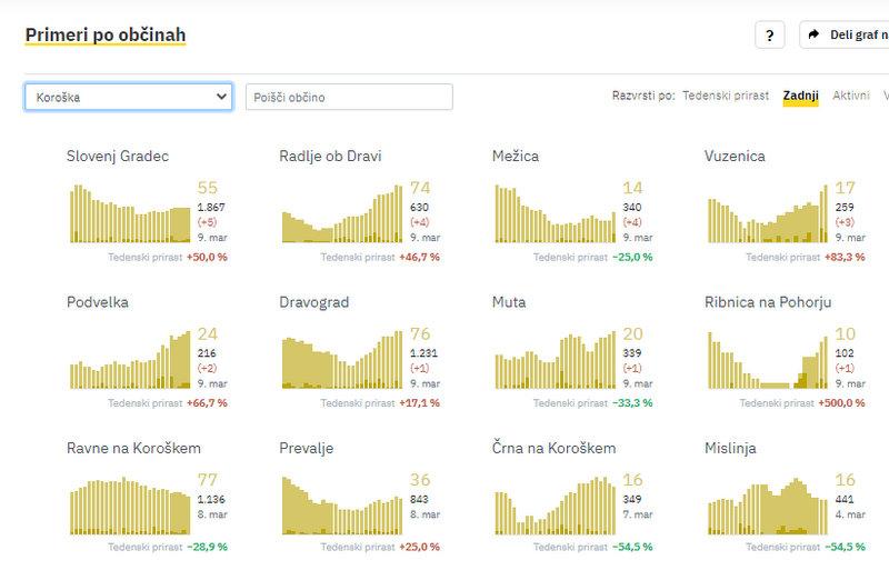 Na Koroškem so v torek največ novih okužb potrdili v Slovenj Gradcu, in sicer 5. V Radljah in v Mežici po 4, v Vuzenici 3, v Podvelki 2, v Dravogradu, na Muti in v Ribnici na Pohorju pa po 1 novo okužbo.
