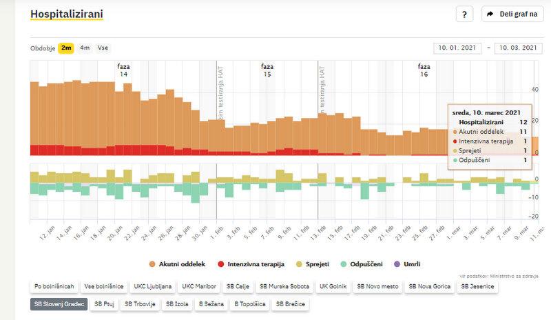 Po podatkih sledilnika v SB Slovenj Gradec zdravijo 12 covidnih bolnikov, 1 od teh potrebuje intenzivno nego.
