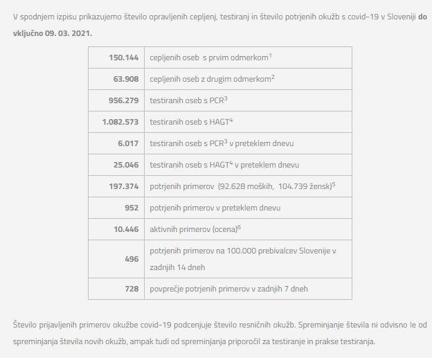 Število opravljenih cepljenj, testiranj in število potrjenih okužb s covid-19 v Sloveniji do vključno 09. 03. 2021.