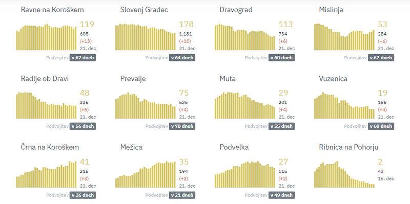 Na Koroškem so največ novih okužb potrdili na Ravnah na Koroškem, in sicer 13, v Slovenj Gradcu 10, v Dravogradu in Mislinji po 6, v Radljah ob Dravi 5, na Prevaljah, Muti in v Vuzenici po 4, v Črni na Koroškem 3, v Mežici in Podvelki po 2.